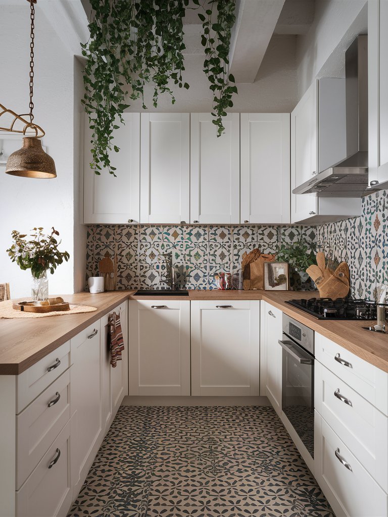 The wooden countertops in this kitchen provide a warm and inviting contrast to the white cabinets and patterned tiles. Their natural texture and soft tone bring a rustic charm, grounding the space in a sense of authenticity. These countertops are both practical and stylish, offering durability for food preparation while maintaining an understated elegance. The wood tones bridge the gap between the modern white cabinets and the earthy boho elements, ensuring a seamless blend of styles. This choice of material adds a tactile quality to the kitchen, making it feel more intimate and approachable.