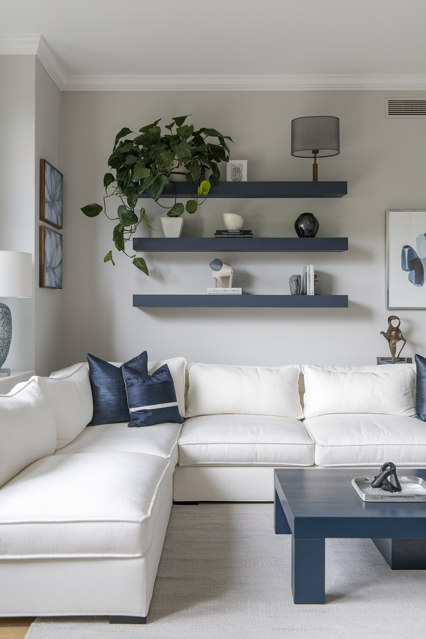 Floating shelves are an elegant way to display your favorite decor without taking up floor space. They can hold anything from books to plants or even artwork. Choose sleek, minimalist designs to keep the shelves looking modern and refined. Mount them high on the wall to draw the eye upward and add visual interest to the room. These shelves not only provide additional storage but also create a sense of openness and airiness, making the space feel sophisticated and organized.