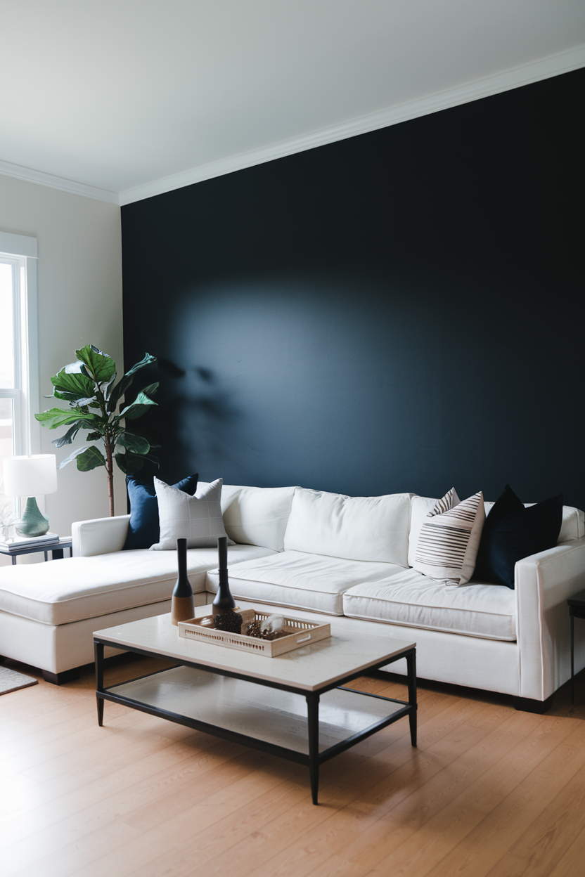 A well-executed accent wall can make your living room feel dramatic and sophisticated. Consider painting one wall in a rich, bold color like navy blue, charcoal gray, or emerald green to create a striking focal point. Darker tones add depth and richness, creating a high-end, designer-inspired look. You can also experiment with wallpaper featuring geometric patterns or metallic accents for an even bolder statement. An accent wall adds a touch of luxury and visual interest, making the room feel more thoughtfully designed.