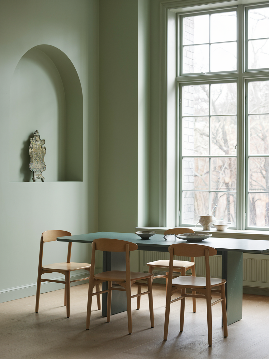 Soft sage green creates a peaceful and welcoming atmosphere that instantly softens the dining space and makes it feel more relaxed. Its muted undertone allows it to function as both a subtle neutral and a gentle color accent, making it incredibly versatile for different design styles. When used on walls, sage green reflects natural light in a soft, diffused way, helping the room feel brighter and more spacious without appearing stark or cold. Pairing it with light wood furniture, linen upholstery, and understated ceramic décor enhances its organic charm. This combination encourages a calm and unhurried dining experience, where conversations flow easily, and the environment feels naturally balanced. Sage green also adapts beautifully across seasons, maintaining its appeal whether styled with warm autumn accents or light summer tones.