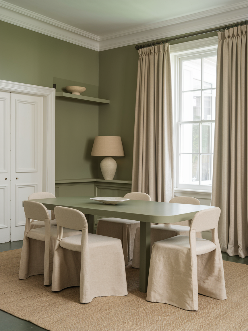 Pairing sage green with neutral textiles creates a layered and harmonious dining environment that feels calm and balanced. Materials such as linen curtains, upholstered chairs, and woven rugs introduce softness and tactile variation, enhancing the overall comfort of the space. Neutral shades like beige, cream, and soft gray complement sage green without competing for attention, allowing the color to remain the focal point while still feeling grounded. This combination results in a cohesive and soothing atmosphere that works well for both casual dining and more formal settings. The layered textures also add depth, ensuring the room feels visually interesting while maintaining a serene and uncluttered aesthetic.