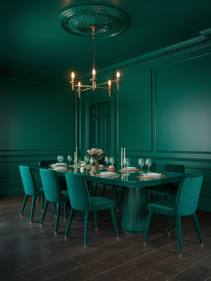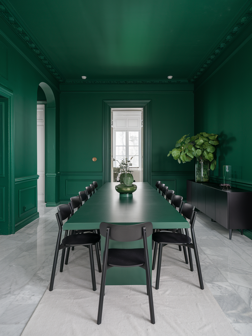 Deep emerald green introduces a rich, jewel-toned depth that transforms a dining room into a luxurious and visually striking space. This bold color works especially well in formal dining areas where a sense of elegance and occasion is desired. Emerald green walls or statement furniture create a dramatic backdrop that pairs beautifully with metallic finishes such as brass or gold, enhancing the overall sense of opulence. When combined with velvet seating, glass surfaces, or marble accents, the room gains layers of texture and contrast that elevate its sophistication. Proper lighting is essential to balance the intensity of this shade, as warm ambient lighting helps soften the look and maintain an inviting atmosphere. The result is a dining space that feels refined, memorable, and perfectly suited for hosting elegant gatherings.