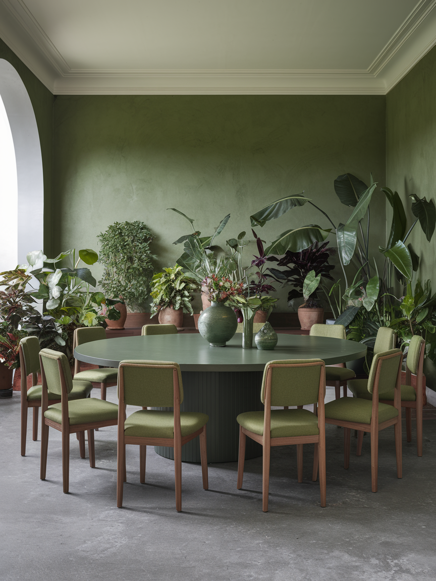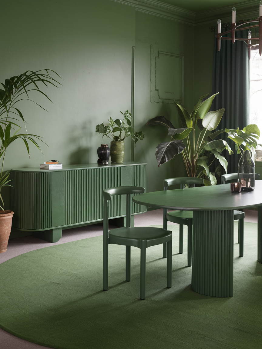 Curved furniture softens the overall look of a green dining room by introducing fluid shapes that contrast with straight architectural lines. Rounded tables, curved chairs, and organic silhouettes create a more relaxed and approachable environment. These shapes improve movement within the space and encourage a natural flow between elements. Curved furniture also complements the organic nature of green tones, reinforcing a sense of harmony and balance. The result is a dining room that feels both stylish and comfortable.