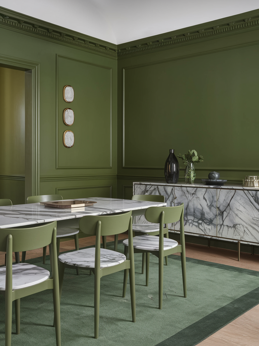 Olive green brings a grounded, nature-inspired warmth to the dining room, creating an environment that feels both cozy and refined. Its earthy undertones make it an excellent choice for spaces that aim to feel relaxed yet stylish. Olive green pairs effortlessly with natural materials such as wood, stone, and woven textures, enhancing its organic character. When used on walls or cabinetry, it provides a rich backdrop that complements neutral fabrics, cream tones, and handcrafted décor. This color works particularly well in transitional, rustic, or Mediterranean-inspired interiors, where comfort and authenticity are key. The overall effect is a dining room that feels welcoming, harmonious, and suitable for both everyday meals and special occasions, offering a perfect balance between casual living and timeless design.