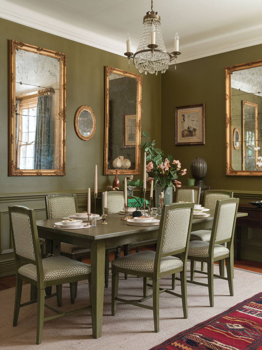 Gold-framed mirrors enhance olive green dining rooms by adding warmth, light, and a sense of expanded space. Mirrors reflect both natural and artificial lighting, making the room feel brighter and more open. The gold frames complement olive green’s earthy tones, creating a harmonious and elegant pairing. This combination works especially well in dining rooms that benefit from additional visual depth and brightness, while also serving as a decorative focal point.