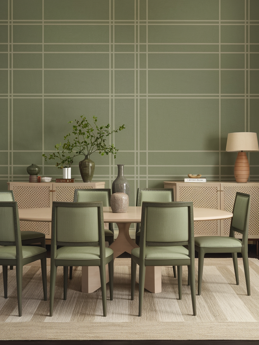 Green wallpaper adds both color and pattern, allowing you to introduce visual interest in a controlled and elegant way. From subtle textures to intricate designs, wallpaper can define the character of the dining room without overwhelming it. It works especially well as an accent wall or in spaces that benefit from added depth and dimension. When paired with simple furniture and neutral accents, patterned wallpaper becomes a standout feature that elevates the overall design. This approach creates a curated and polished look that feels intentional and sophisticated.