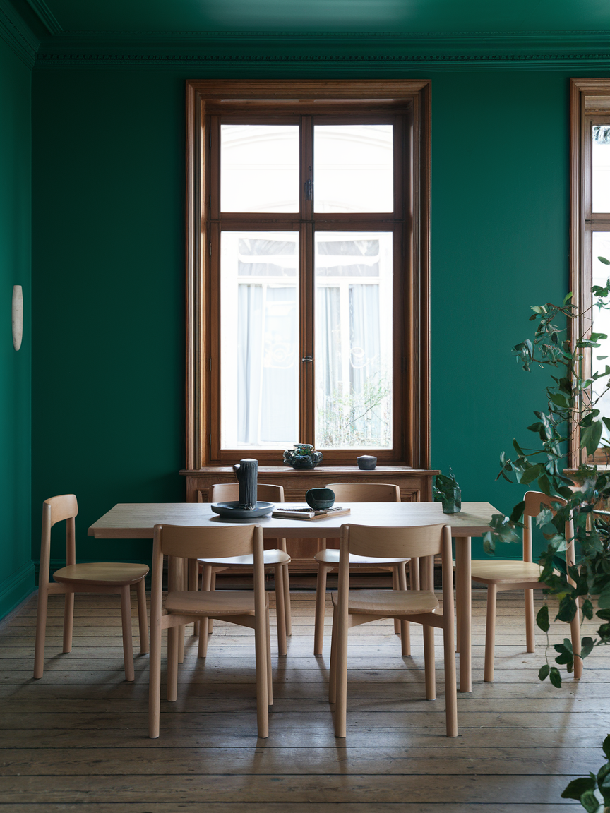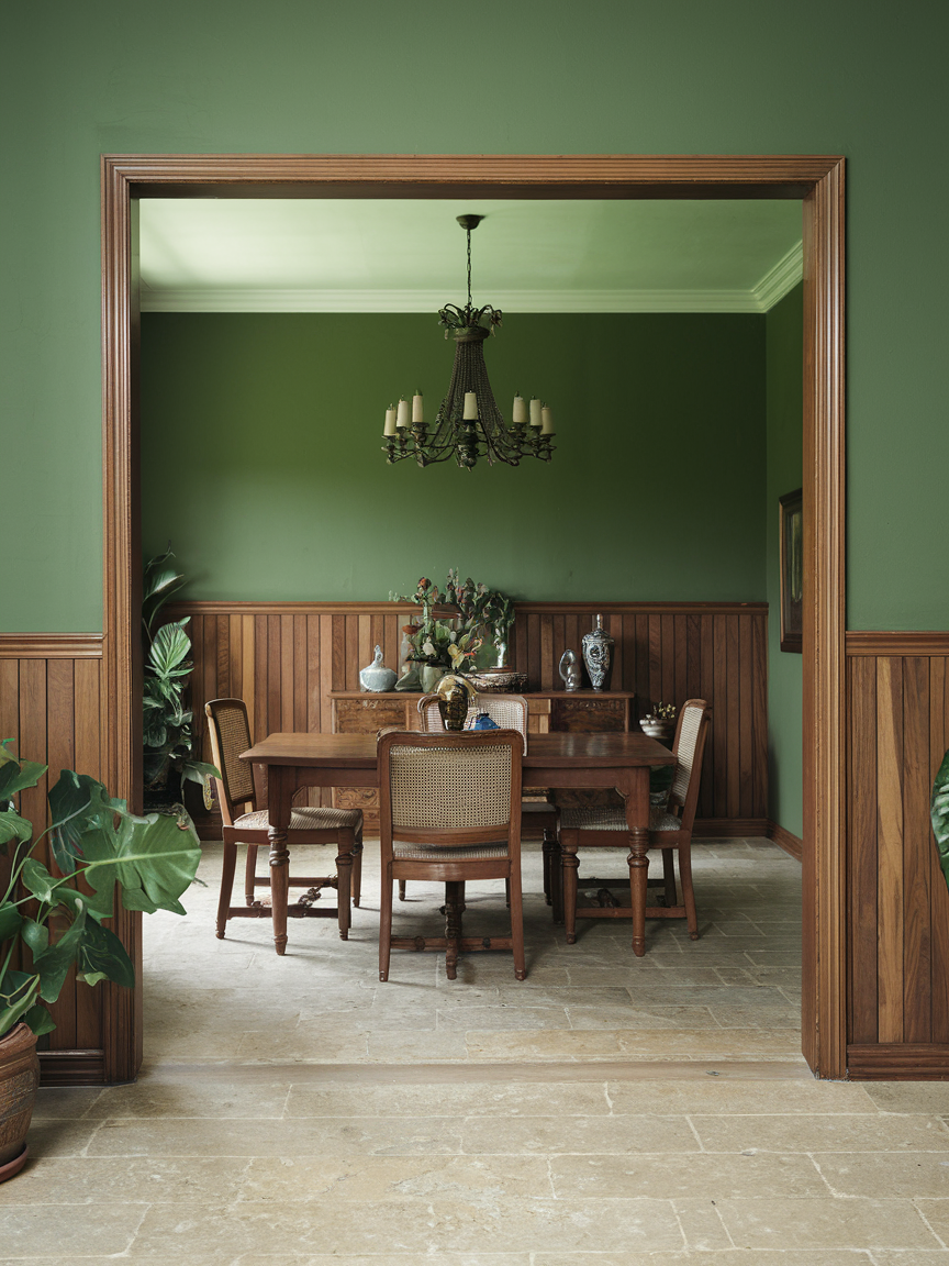 Natural wood and green form a classic pairing that brings warmth, texture, and timeless appeal to the dining room. Wooden dining tables, chairs, or cabinetry soften the visual impact of green walls while adding an organic, grounded quality to the space. Lighter woods help maintain an airy and modern feel, while darker woods introduce richness and contrast that complement deeper green shades. This combination works across a variety of styles, from rustic and farmhouse to contemporary and transitional interiors. The presence of natural wood also adds durability and longevity to the design, ensuring that the space remains functional and aesthetically pleasing over time. Together, green and wood create a dining environment that feels balanced, welcoming, and naturally elegant.