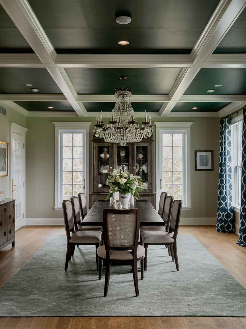 A dark green ceiling introduces an unexpected design element that adds drama and intimacy to the dining room. By drawing the eye upward, it creates a sense of enclosure that feels cozy and sophisticated. This technique works particularly well when paired with lighter walls and warm lighting, ensuring the space remains balanced and inviting. The contrast between the ceiling and the rest of the room enhances architectural features and adds depth. It’s a bold yet refined choice that elevates the overall design.