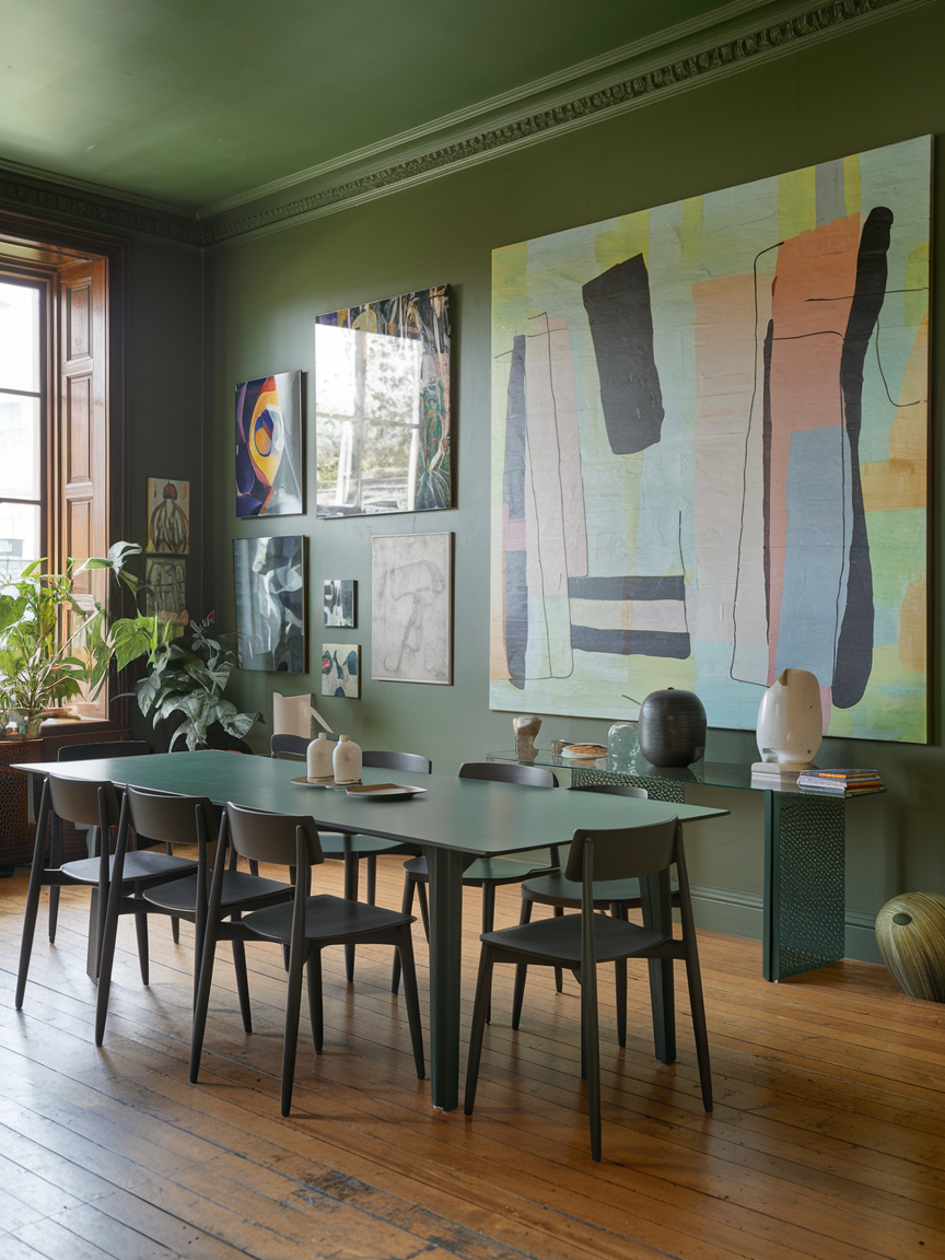 Artwork adds personality and visual interest to green dining rooms, transforming them into curated and expressive spaces. A large statement piece or a gallery wall can serve as a focal point that complements the surrounding décor. Art allows you to introduce additional colors, textures, and themes while maintaining cohesion with the green palette. When thoughtfully selected, it enhances the overall atmosphere and makes the dining room feel more personalized and complete.