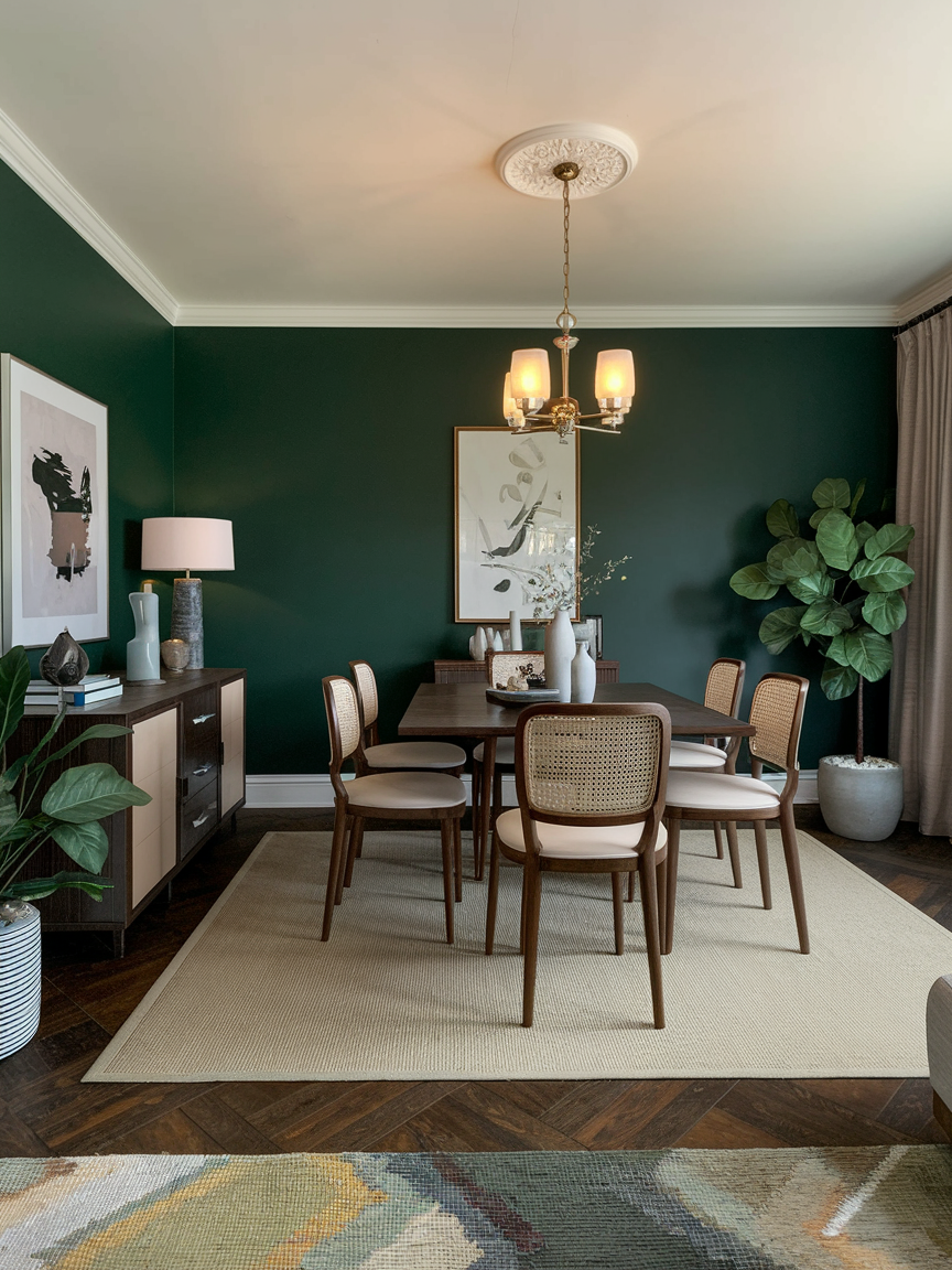 A forest green accent wall introduces depth and character without overwhelming the entire dining space. By focusing this rich tone on a single wall—often behind the dining table or sideboard—you create a natural focal point that anchors the room’s layout. This design approach allows you to experiment with darker hues while maintaining balance through lighter surrounding elements. Forest green pairs beautifully with warm wood finishes, black metal accents, and neutral upholstery, creating a layered and cohesive look. Adding artwork, mirrors, or shelving against the accent wall further enhances its visual appeal. The result is a dining room that feels intimate, grounded, and thoughtfully designed, offering just the right amount of drama while remaining comfortable and inviting.