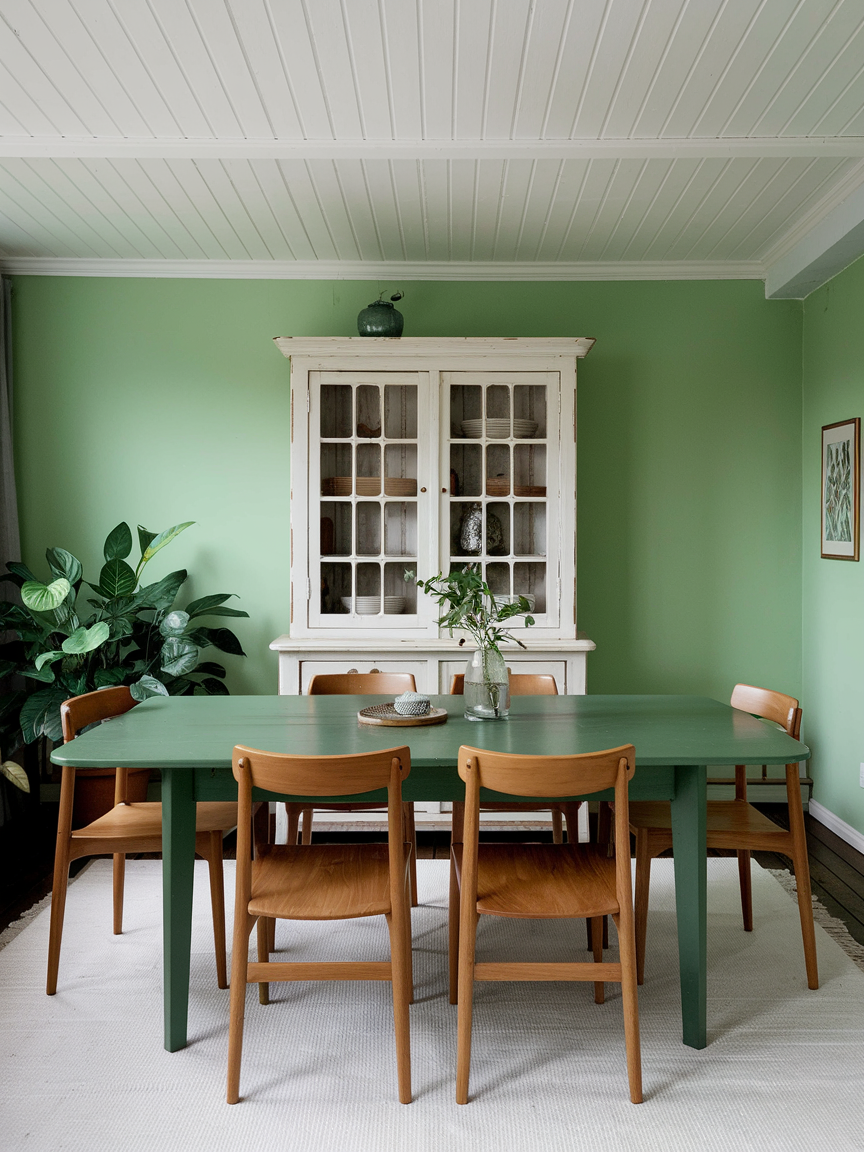 Mint green brings a light, refreshing energy that instantly brightens the dining room and creates a sense of openness. Its soft pastel tone works particularly well in spaces with abundant natural light, where it enhances brightness and contributes to an airy atmosphere. When paired with white furniture, glass elements, or minimalistic décor, mint green creates a clean and cheerful aesthetic that feels modern and approachable. Subtle metallic accents or delicate lighting fixtures can add just enough sophistication without overpowering the softness of the color. Mint green dining rooms often feel relaxed and uplifting, making them ideal for casual dining spaces where comfort and simplicity are prioritized alongside style.