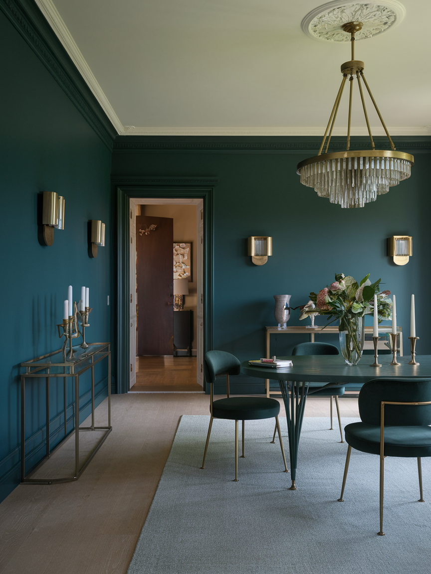Dark green paired with brass accents creates a luxurious and visually balanced dining room that feels both rich and refined. The depth of dark green provides a dramatic backdrop, while brass elements introduce warmth and subtle shine that elevate the overall design. This combination works beautifully in spaces with classic or contemporary influences, where elegant lighting fixtures, framed mirrors, or decorative hardware can enhance the aesthetic. The reflective quality of brass helps prevent the dark tones from feeling too heavy, ensuring the space remains inviting. With proper lighting, this pairing creates a cozy yet upscale atmosphere, making it ideal for evening dining and formal entertaining.