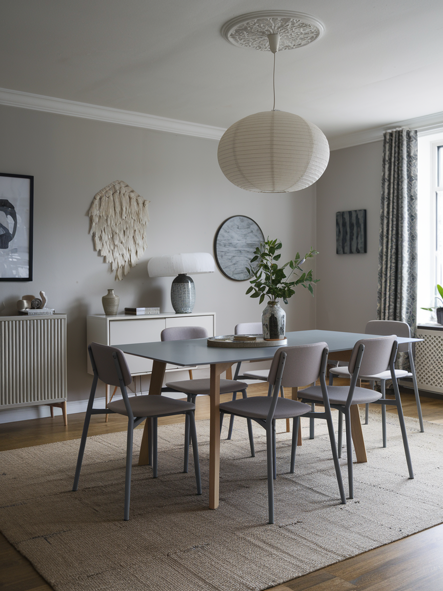 A grey area rug beneath the dining table adds softness, warmth, and definition to the room. Rugs help absorb sound, making conversations feel more intimate and comfortable. Choosing a rug with a subtle pattern or texture prevents the grey from feeling flat while adding visual interest. Warmer grey tones or rugs with beige undertones work best for cozy dining rooms. In open-plan layouts, a rug clearly defines the dining area, creating a sense of enclosure and comfort. This simple addition enhances both aesthetics and functionality, making the dining room feel more inviting.