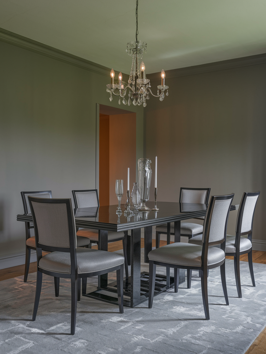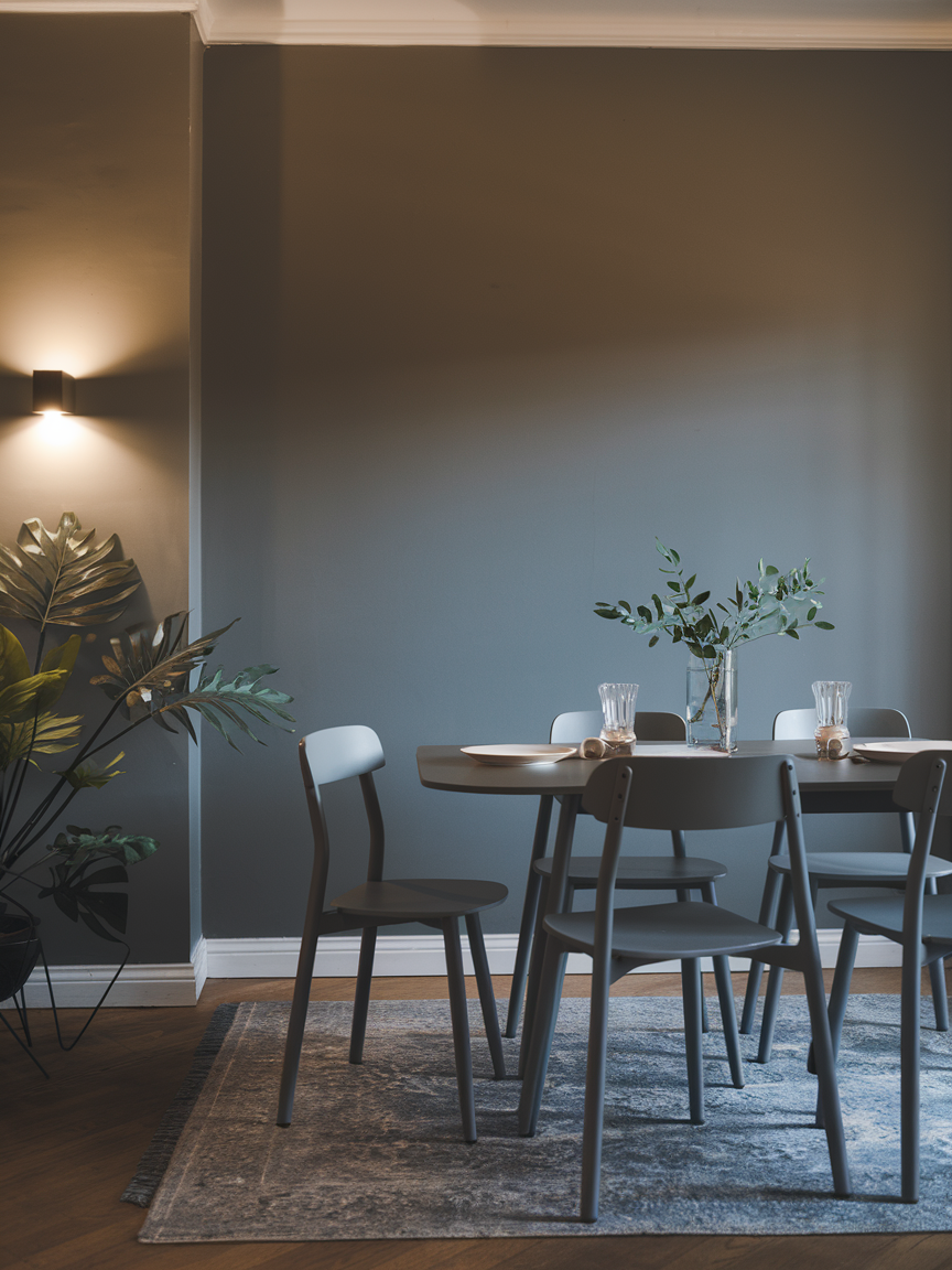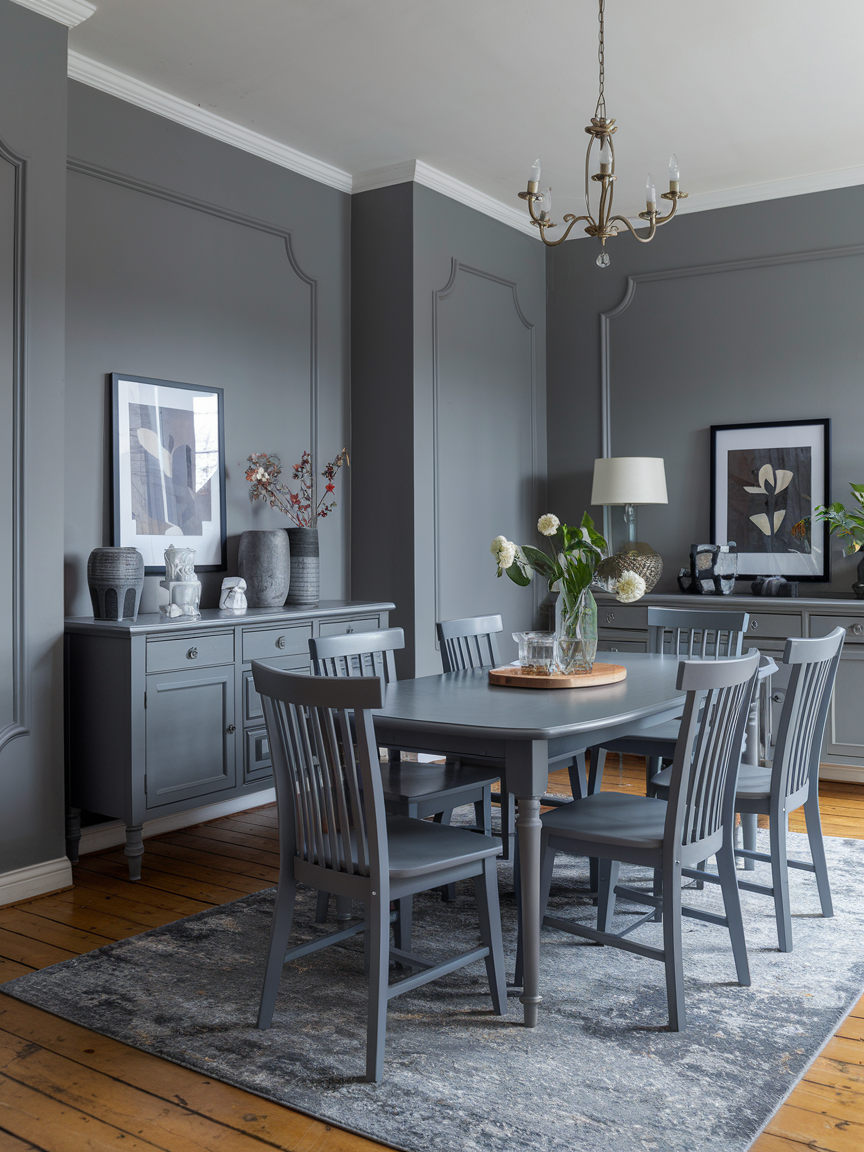 Dark grey dining rooms can feel incredibly cozy when balanced correctly with lighter accents. Deep charcoal or slate walls create an intimate, enveloping atmosphere, ideal for evening dining and entertaining. To prevent the space from feeling heavy, light elements such as white tableware, pale wood furniture, or soft metallic finishes provide contrast and brightness. Mirrors and reflective surfaces can also help bounce light around the room. This balance allows dark grey to feel dramatic yet welcoming rather than oppressive. When executed thoughtfully, a dark grey dining room feels sophisticated, warm, and cocoon-like—perfect for creating a sense of comfort and elegance without sacrificing visual interest.