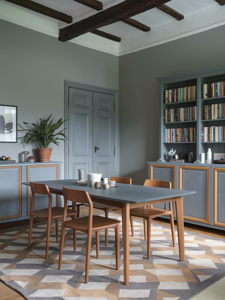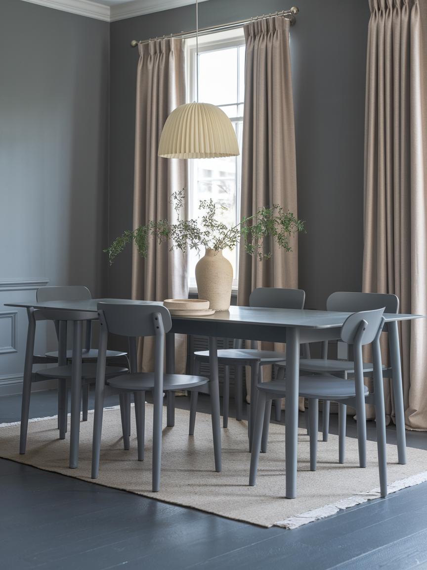 Combining grey with beige creates a dining room that feels balanced and calming. Beige softens grey’s coolness, resulting in a warm, neutral palette. This pairing works well in both traditional and modern interiors. Beige upholstery, rugs, or decor add lightness, while grey grounds the space. Natural textures enhance the cozy feel. Together, grey and beige create an environment that feels gentle, welcoming, and timeless.