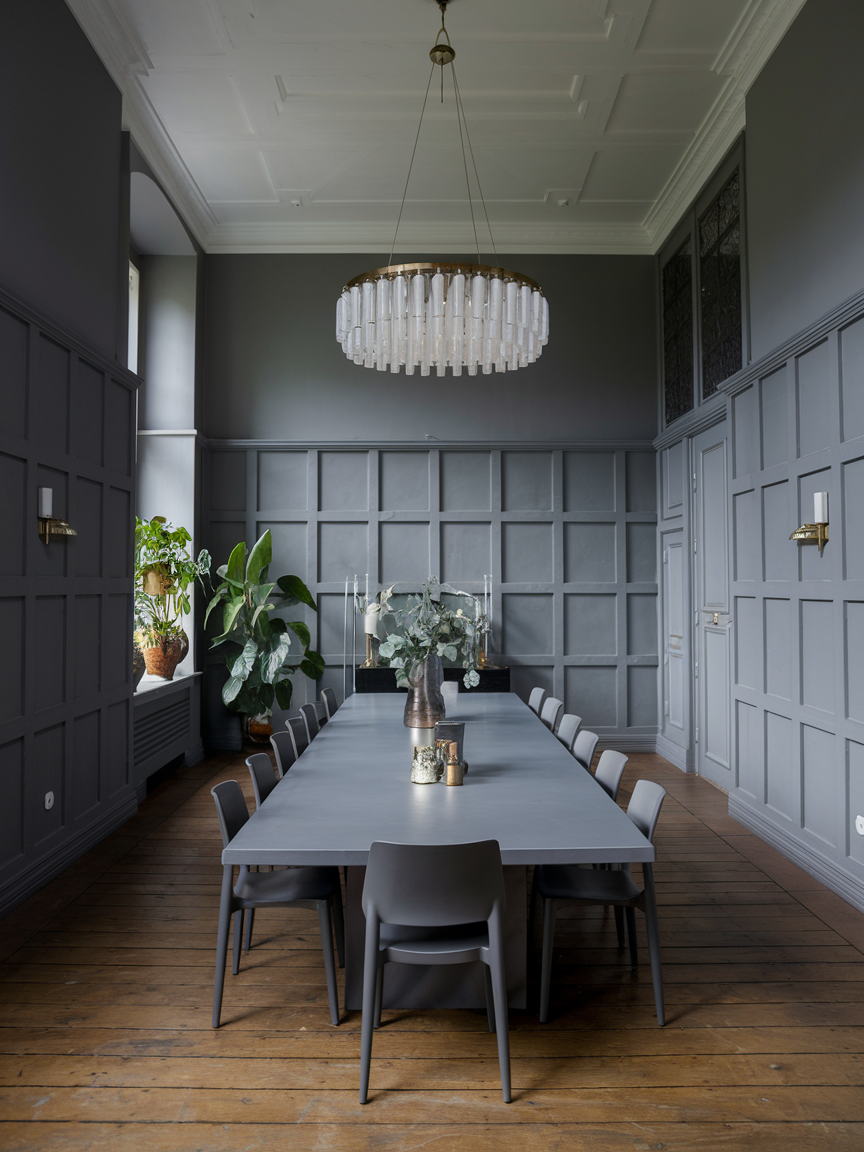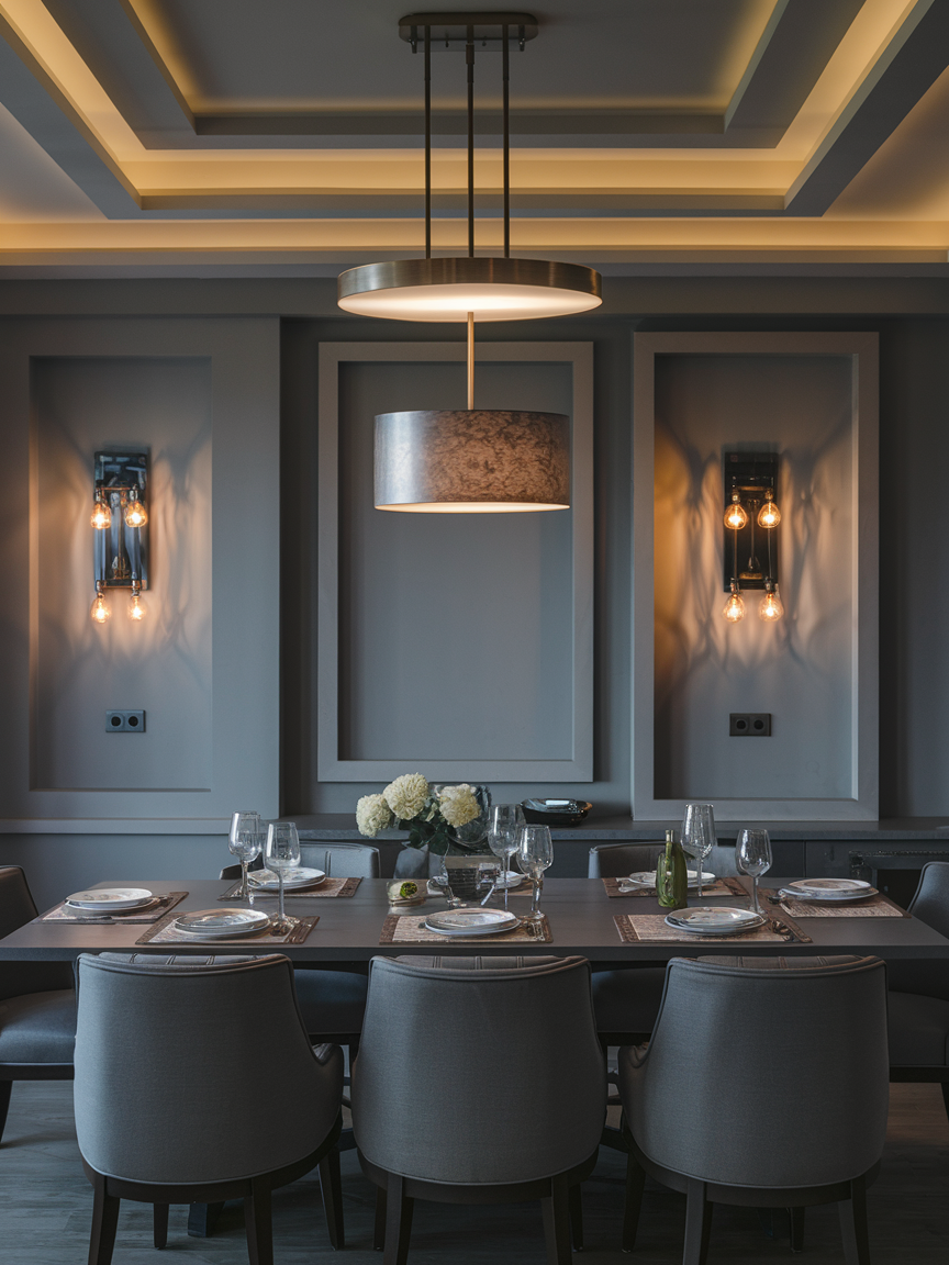 Grey wall paneling adds texture, depth, and sophistication to a dining room. Unlike flat walls, paneling introduces structure that enhances coziness. Choosing a warm grey tone ensures the space feels inviting rather than formal. Paneling works beautifully with classic or modern furniture, offering timeless appeal. Soft lighting highlights the panel details, creating subtle shadows that add warmth. This architectural feature elevates the dining room, making it feel thoughtfully designed and comfortable.