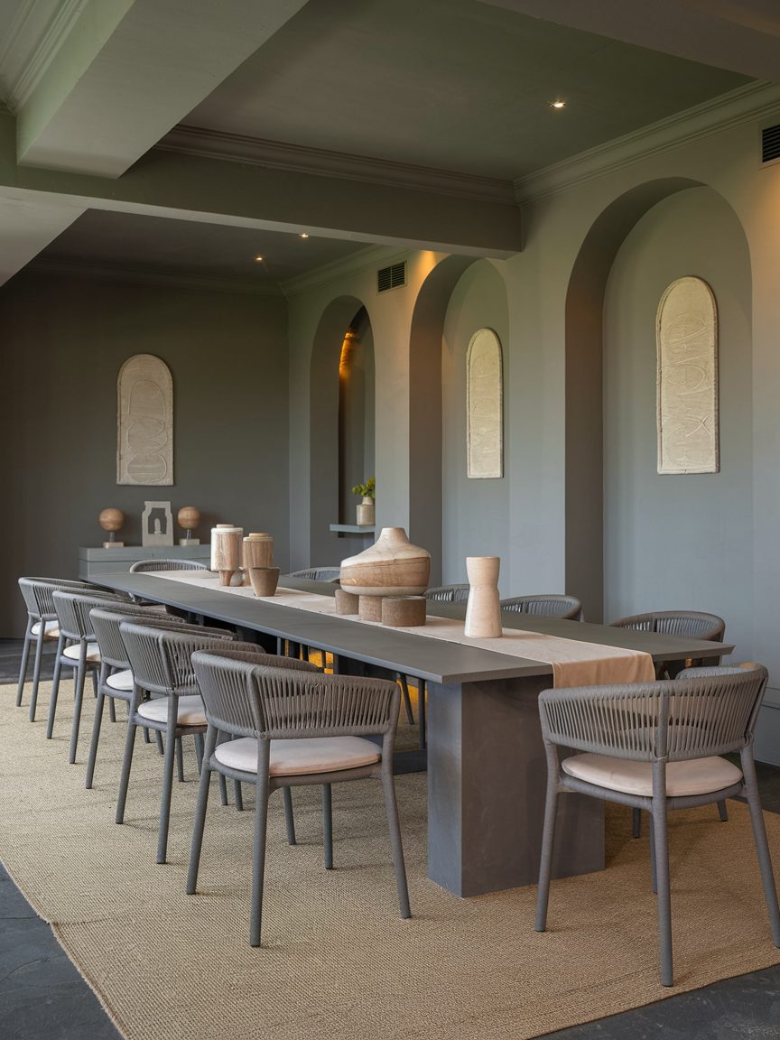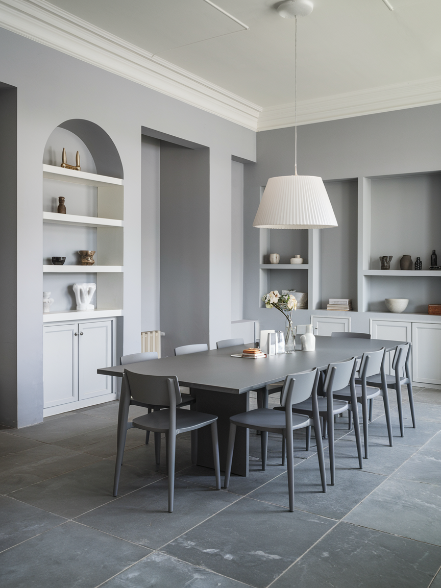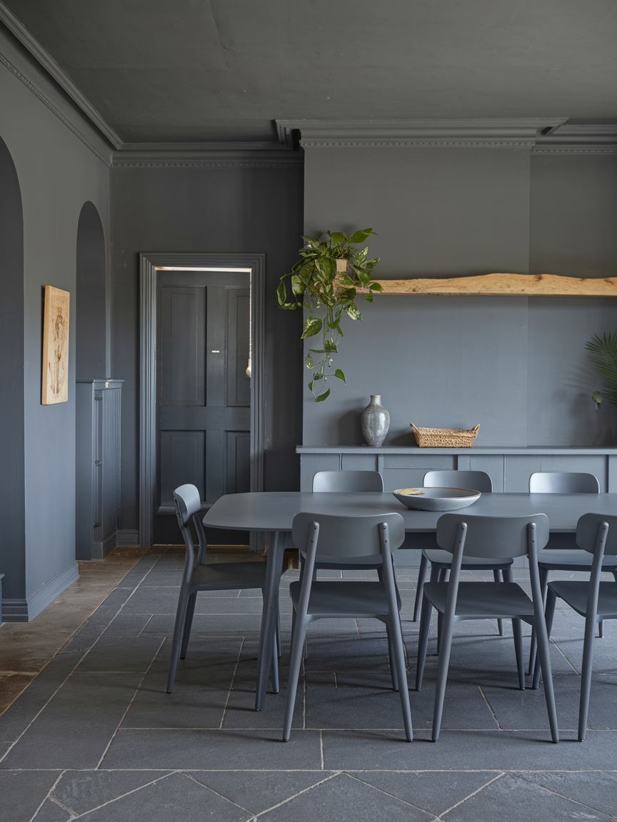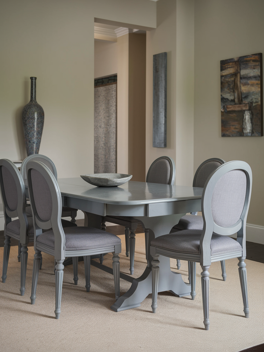 A grey dining table offers a stylish alternative to traditional wood while maintaining warmth and elegance. Whether finished in painted wood, concrete, or stone, grey tables feel modern and refined. Pairing them with upholstered or wooden chairs prevents the look from becoming too cool. A grey table acts as a neutral anchor, allowing table styling, lighting, and seating to stand out. This choice suits contemporary and transitional interiors, creating a dining space that feels both current and inviting.