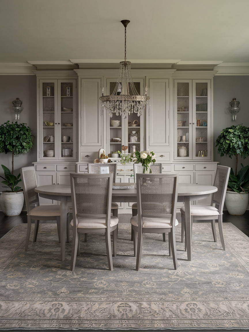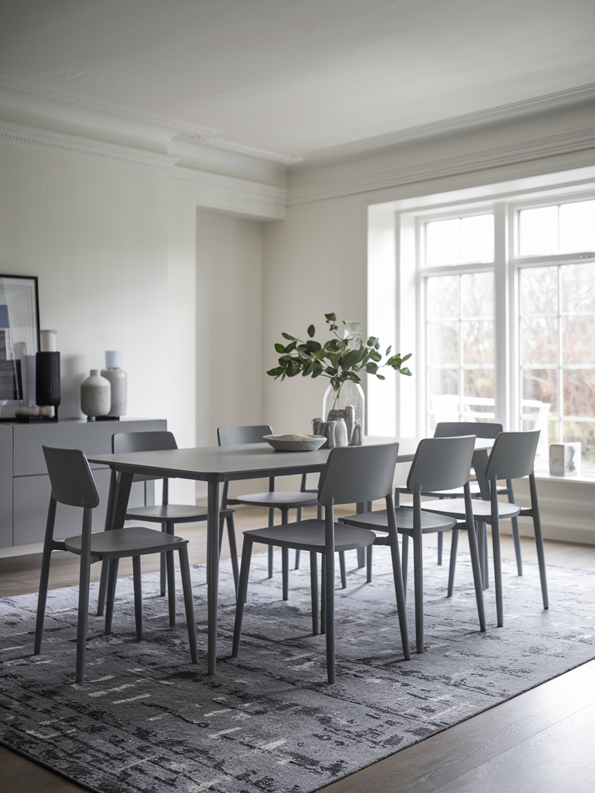 An area rug is an essential element in creating a cozy grey dining room, as it visually anchors the table and adds softness underfoot. Rugs in warm grey tones, subtle patterns, or textured weaves prevent the space from feeling too rigid or cold. Natural fibers such as wool or blended materials enhance comfort while adding durability for everyday use. A well-chosen rug also helps define the dining area, especially in open-plan layouts. By introducing pattern or tonal variation, the rug adds depth to the grey palette without overpowering it. This layer not only improves acoustics by reducing echo but also contributes to an inviting, intimate dining atmosphere where comfort and style coexist beautifully.