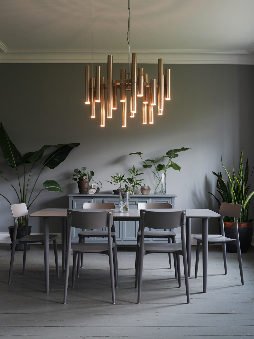 A statement lighting fixture can become the heart of a grey dining room, drawing attention while enhancing warmth. Chandeliers, sculptural pendants, or oversized fixtures add personality and visual drama. When paired with grey tones, lighting becomes even more impactful, as it highlights the subtle variations in color and texture. Choosing fixtures with warm finishes—such as brass, bronze, or matte black—adds contrast and sophistication. Beyond aesthetics, statement lighting creates a focal point that makes the dining room feel intentional and inviting. The right fixture transforms the space from simple to memorable, reinforcing both comfort and style.