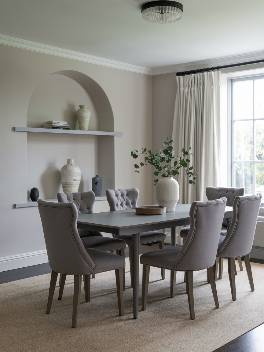 Layering soft neutrals within a grey dining room creates a cozy, cohesive look that feels effortlessly inviting. Shades like beige, cream, taupe, and warm white complement grey beautifully, adding warmth without disrupting the color scheme. These tones can be introduced through table linens, curtains, artwork, or decorative accessories. The subtle contrast keeps the room visually interesting while maintaining a calm and balanced atmosphere. Layering also allows the dining room to feel more personalized and less rigid. This approach is ideal for those who want a serene, welcoming space that feels timeless rather than trend-driven, making the dining room comfortable for both everyday use and special gatherings.