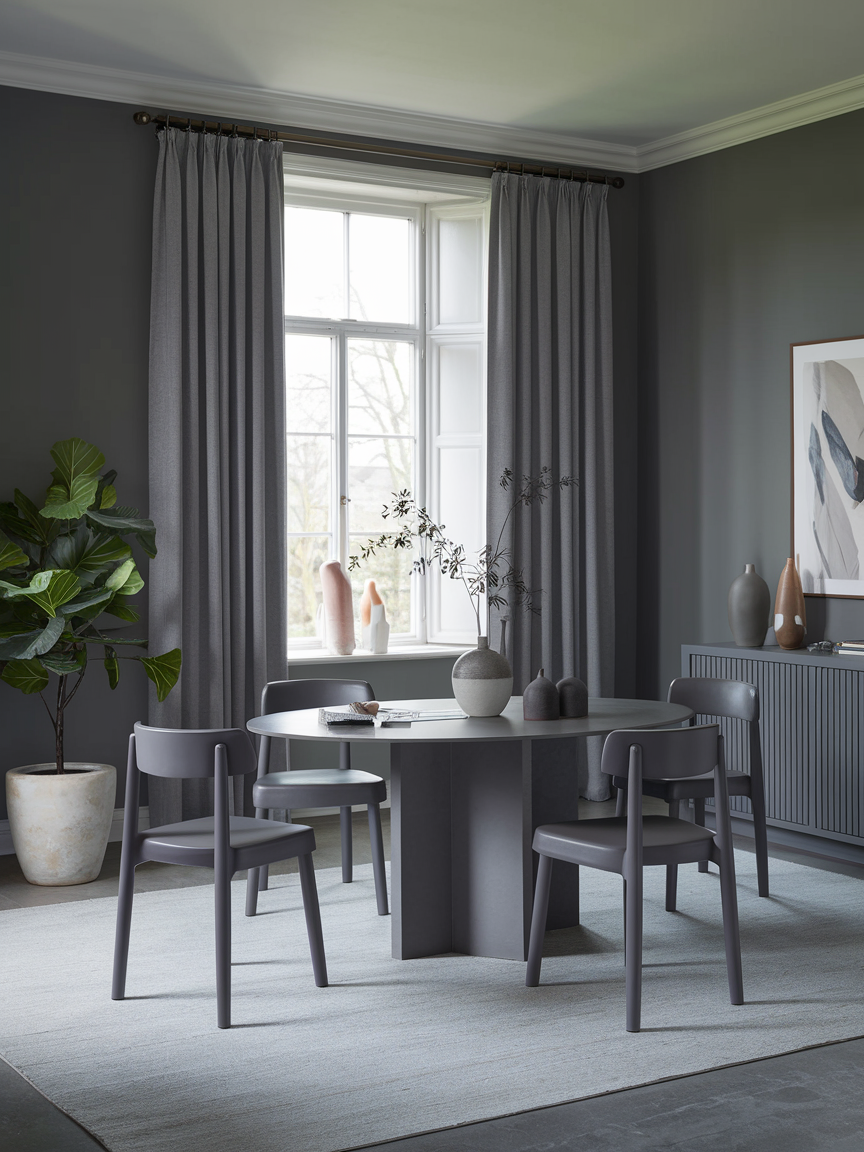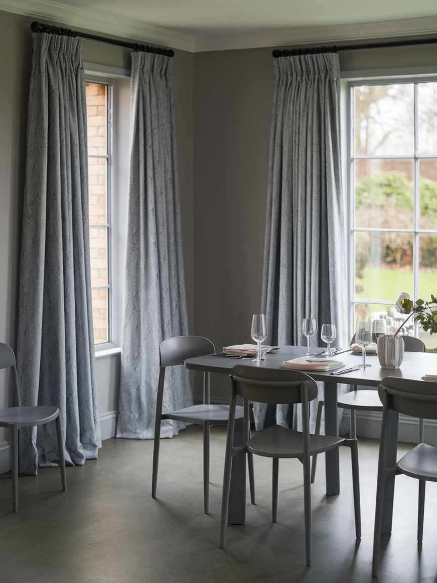 Grey curtains frame windows beautifully while adding softness and warmth to the dining room. Fabric choices such as linen, cotton, or velvet enhance texture and improve acoustics. Warmer grey tones prevent the space from feeling cold, especially during evening meals. Hanging curtains from ceiling height creates a sense of elegance and visual height. Grey curtains also allow flexibility, pairing easily with both neutral and colorful decor. They filter natural light gently, contributing to a calm and welcoming dining atmosphere that feels polished yet cozy.