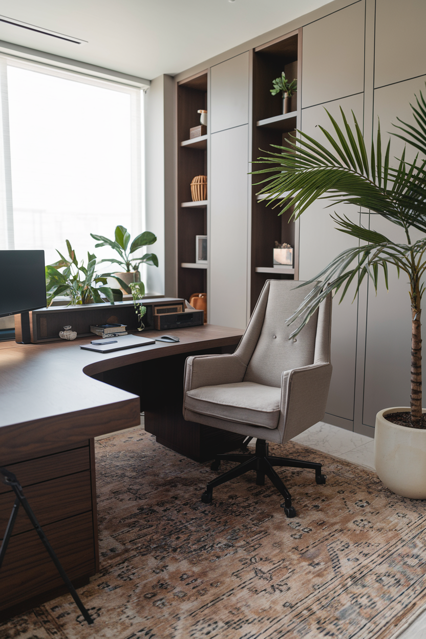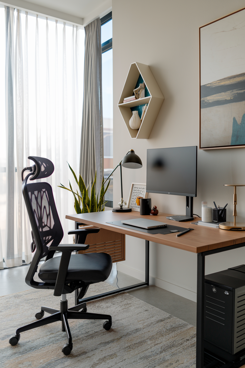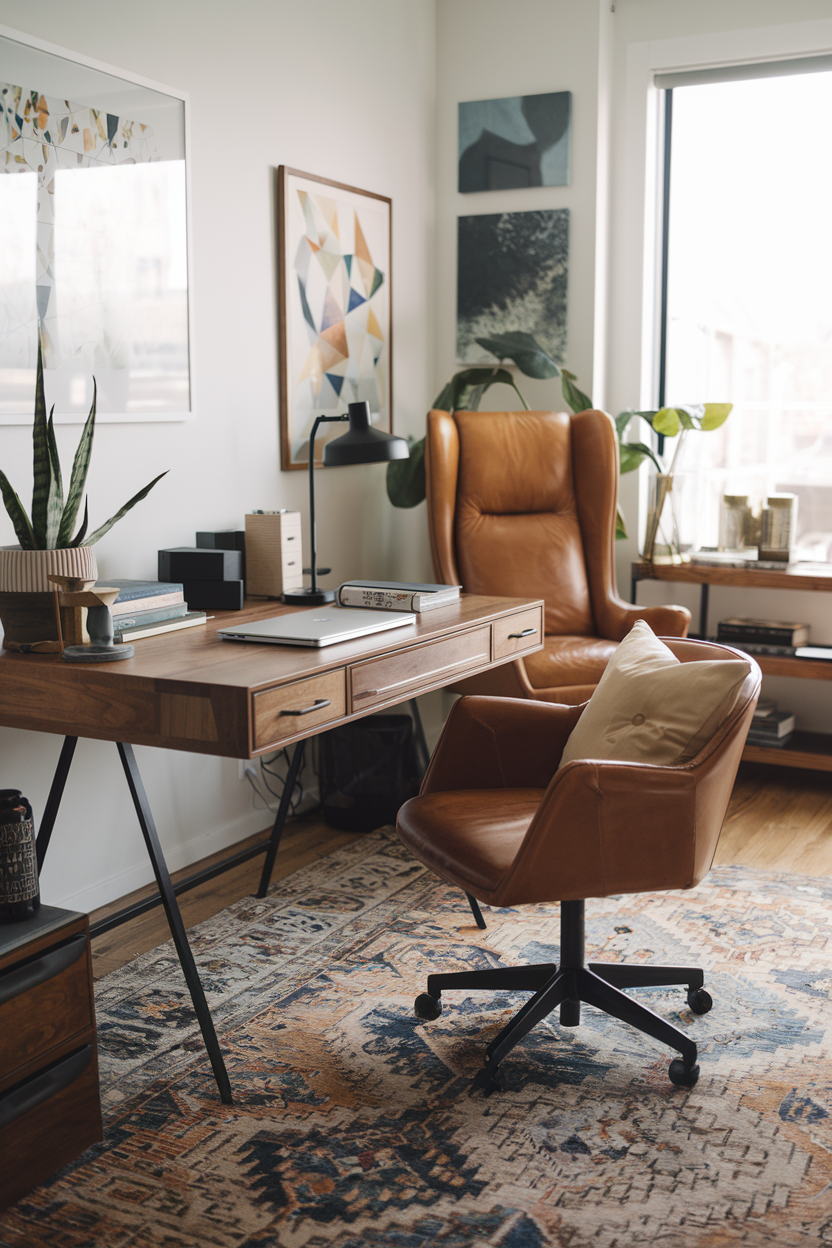 Comfortable seating is key to a productive home office, especially if you often have meetings or need to spend long hours at your desk. Invest in a neutral, ergonomic chair that provides lumbar support to ensure comfort throughout the day. A good chair allows you to focus on your tasks without distraction from discomfort. Choose a style that complements your office’s aesthetic, whether it’s a classic mid-century modern design, a sleek contemporary look, or something more plush for added comfort. If space allows, consider adding an additional cozy seating area for relaxation during breaks.