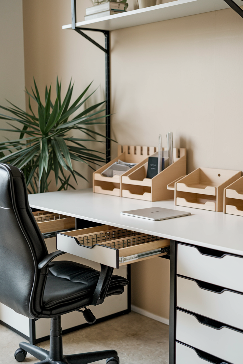 An organized office is a more productive office. Keep your workspace neat by using organizers and drawer dividers to separate different items. Desk organizers can hold pens, notebooks, and other small essentials, while drawer dividers can sort paperwork, cables, and files. Use aesthetically pleasing containers, like wooden trays or chic metal organizers, that complement your office decor. A clutter-free desk reduces stress and boosts productivity, allowing you to focus on your tasks instead of hunting for supplies.