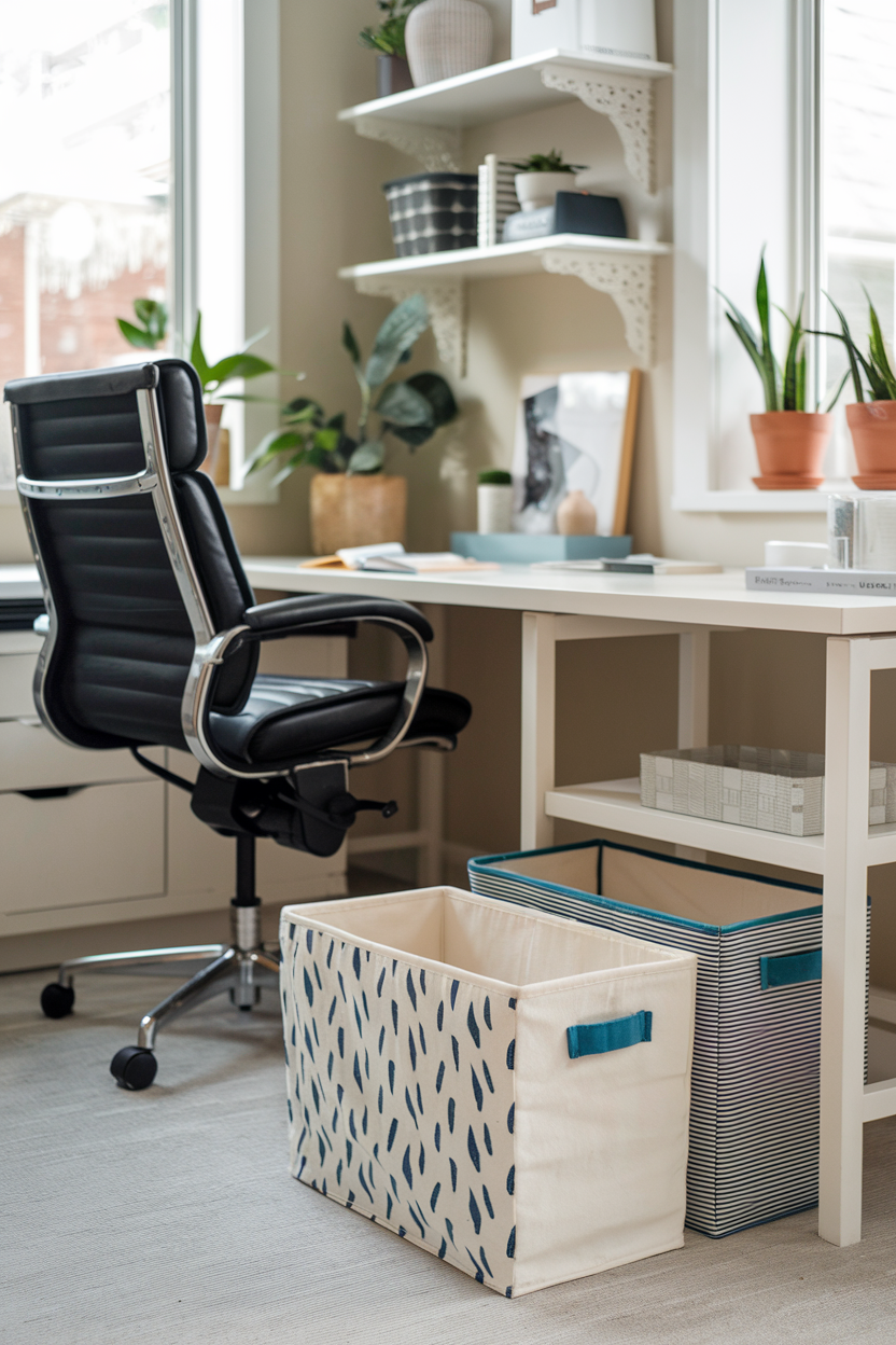 Storage bins are an easy way to organize items while maintaining the style of your office. Choose bins made from materials like fabric, metal, or woven wicker that match the room’s aesthetic. They can be used to store everything from paper files to office supplies, ensuring that clutter is kept out of sight but still easily accessible. Opt for decorative bins with handles for a functional yet stylish way to keep your office tidy.