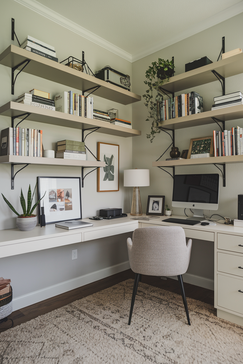 Maximize vertical space by installing floating shelves on the walls of your home office. These minimalist shelves can store books, decorative items, office supplies, or even plants. Floating shelves give the room a modern, airy feel and reduce clutter, allowing you to keep important items within reach but off your desk. They can also be used to display personal touches, like framed photos or art, creating a more welcoming atmosphere while keeping the space organized.