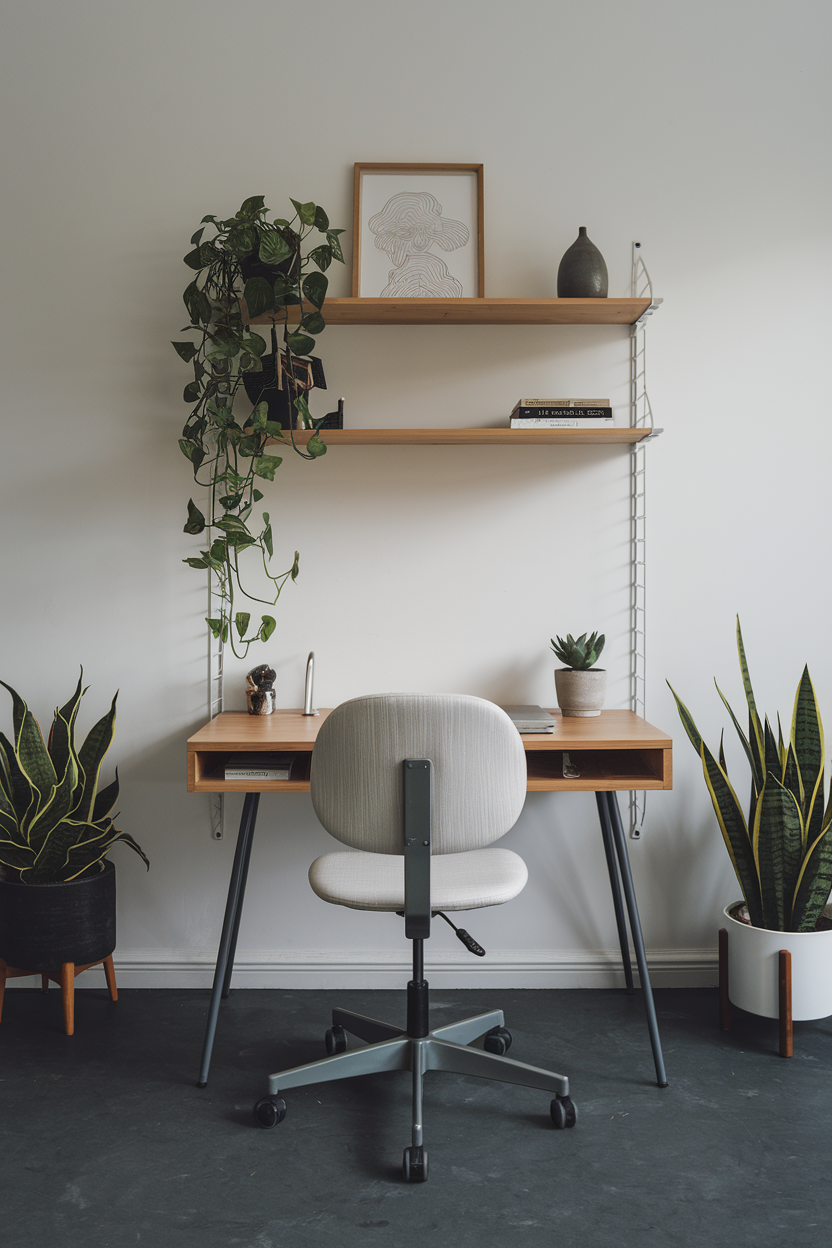 Introducing plants into your office not only adds a natural aesthetic but also improves air quality and reduces stress levels. Plants like succulents, ferns, or snake plants are easy to care for and thrive indoors, adding vibrancy to your workspace. You can hang plants from the ceiling, place them on floating shelves, or keep small potted plants on your desk. Whether you opt for large leafy greens or small desk-friendly succulents, plants bring life to the room, making it feel more welcoming and less sterile.