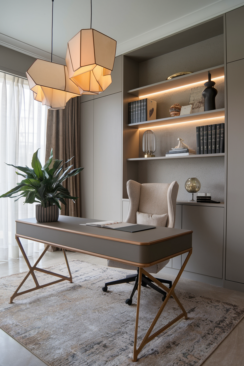 Lighting is crucial in any home office, and choosing the right fixtures can make a huge difference in the overall atmosphere. Statement lighting, such as a bold desk lamp or a striking overhead chandelier, serves both a functional and decorative purpose. Choose a light fixture that complements your office’s aesthetic, whether that’s a sleek, modern pendant light, a vintage-style brass lamp, or something more industrial. Adjustable task lighting is a must for focused work, while soft ambient lighting can help create a relaxing environment during breaks.