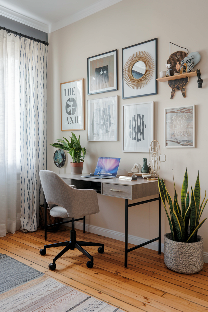 Personalizing your home office with art can inspire creativity and make the space feel truly yours. Frame a few pieces that resonate with you, whether they’re motivational quotes, photographs of places you’ve visited, or original artwork. Art adds personality and character to your workspace, making it more inviting. Opt for a gallery wall with various art pieces, or keep it simple with a few large-scale prints. Choosing art that aligns with your personal taste ensures that the space is both inspiring and comfortable.
