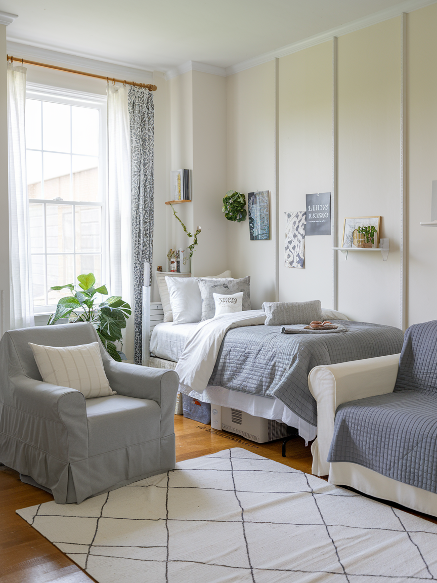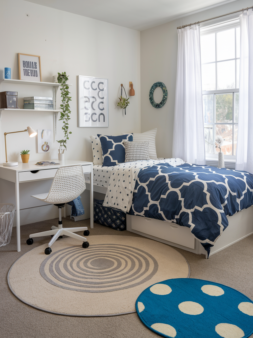 Rugs add color, texture, and warmth to a dorm room. They also help define different areas in a small space, like a study zone versus a lounge area. Choose durable, easy-to-clean rugs that complement your overall aesthetic. Layering smaller rugs or using patterned designs can add depth and personality. A well-placed rug enhances comfort, making your dorm feel more like home and less like a sterile campus room.