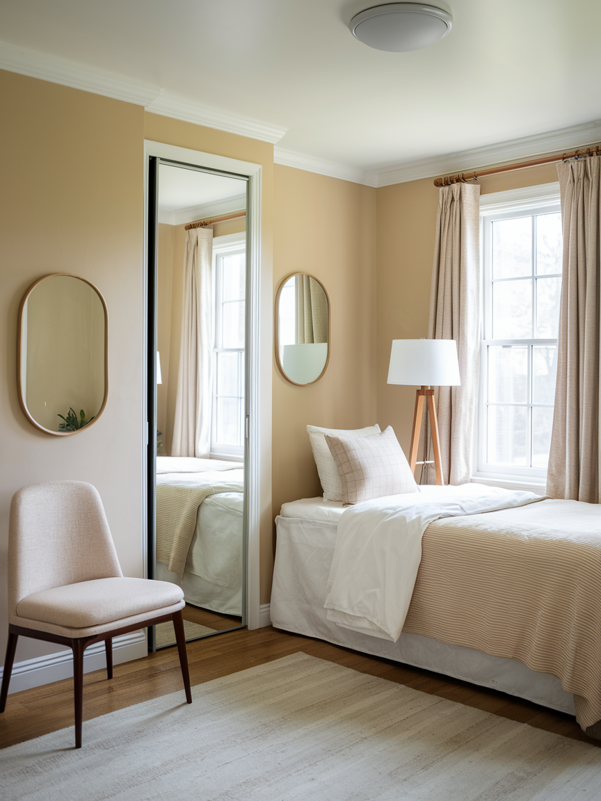 Mirrors reflect light and create the illusion of a larger room. Placing a full-length mirror on the wall or inside a wardrobe door brightens the space and makes it feel airy. Mirrors are also functional for getting ready and checking outfits. Consider decorative frames to add style or stick-on mirrors for easy installation. This simple addition makes a small dorm appear more spacious and stylish simultaneously.