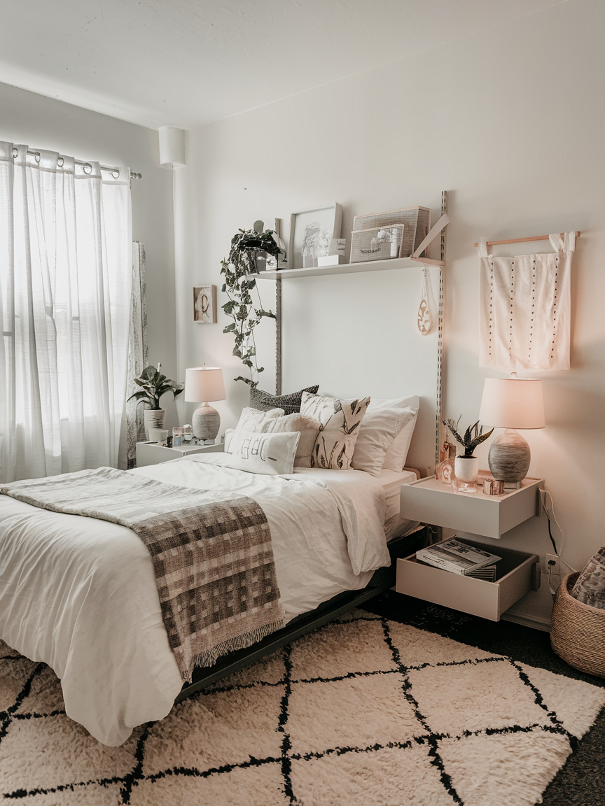Nightstands take up valuable floor space, so floating versions are perfect for dorms. They provide a spot for lamps, phones, or glasses without crowding the floor. Some floating nightstands even have small drawers for storage. This setup keeps essentials within reach while maintaining a clean, minimalist look. Floating nightstands also free up room underneath for additional storage or decorative baskets.