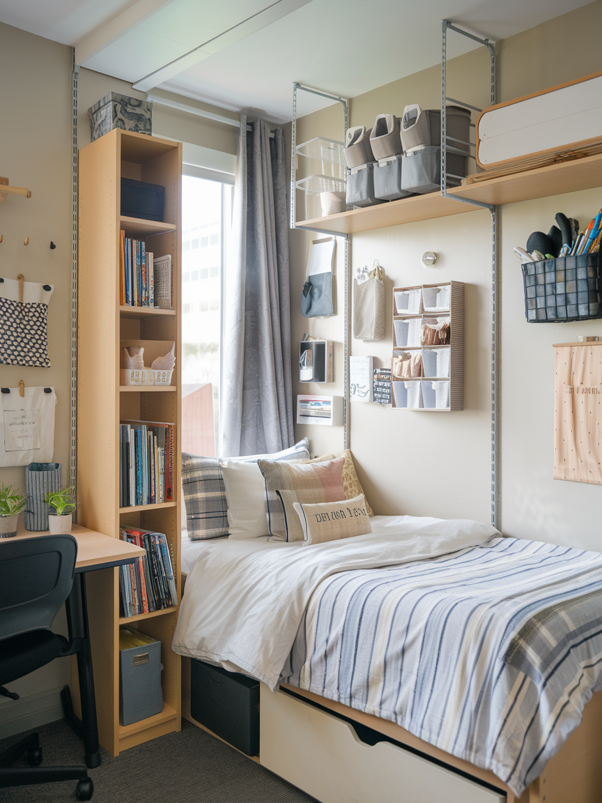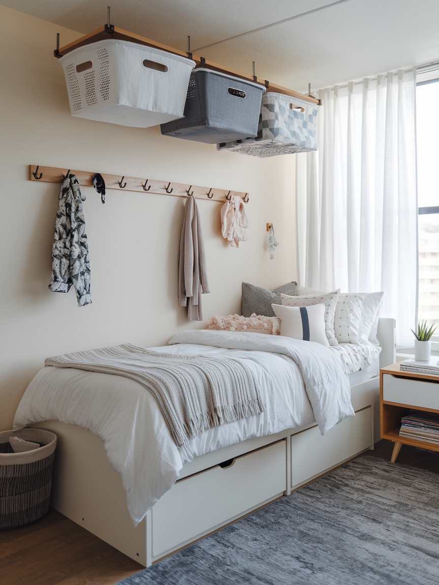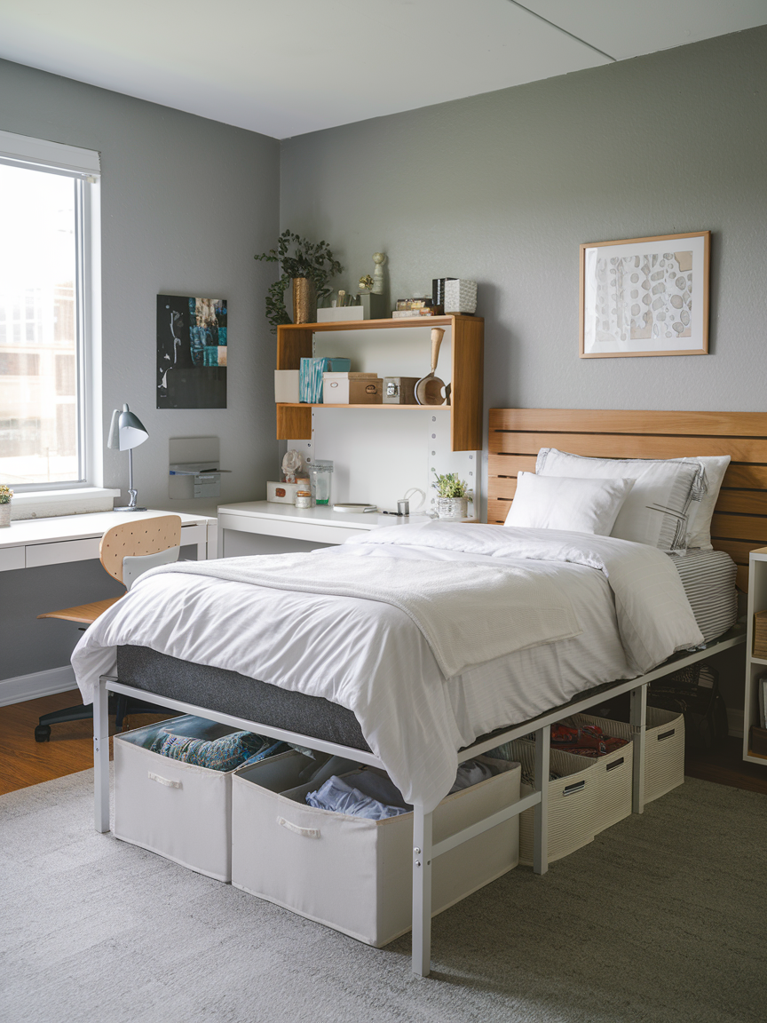 Under-bed storage is essential in compact dorms. Rolling bins, vacuum-sealed bags, or plastic containers make it easy to store off-season clothes, extra bedding, or rarely used items. Using labels keeps everything organized and easily retrievable. This hidden storage solution maximizes space and reduces clutter around the room. Combining under-bed storage with bed risers can further increase storage capacity. It’s a simple strategy that keeps your dorm tidy, helping you focus better and enjoy a cleaner, more organized space.