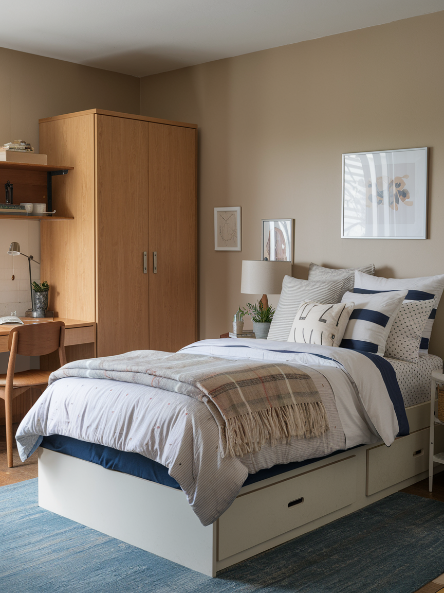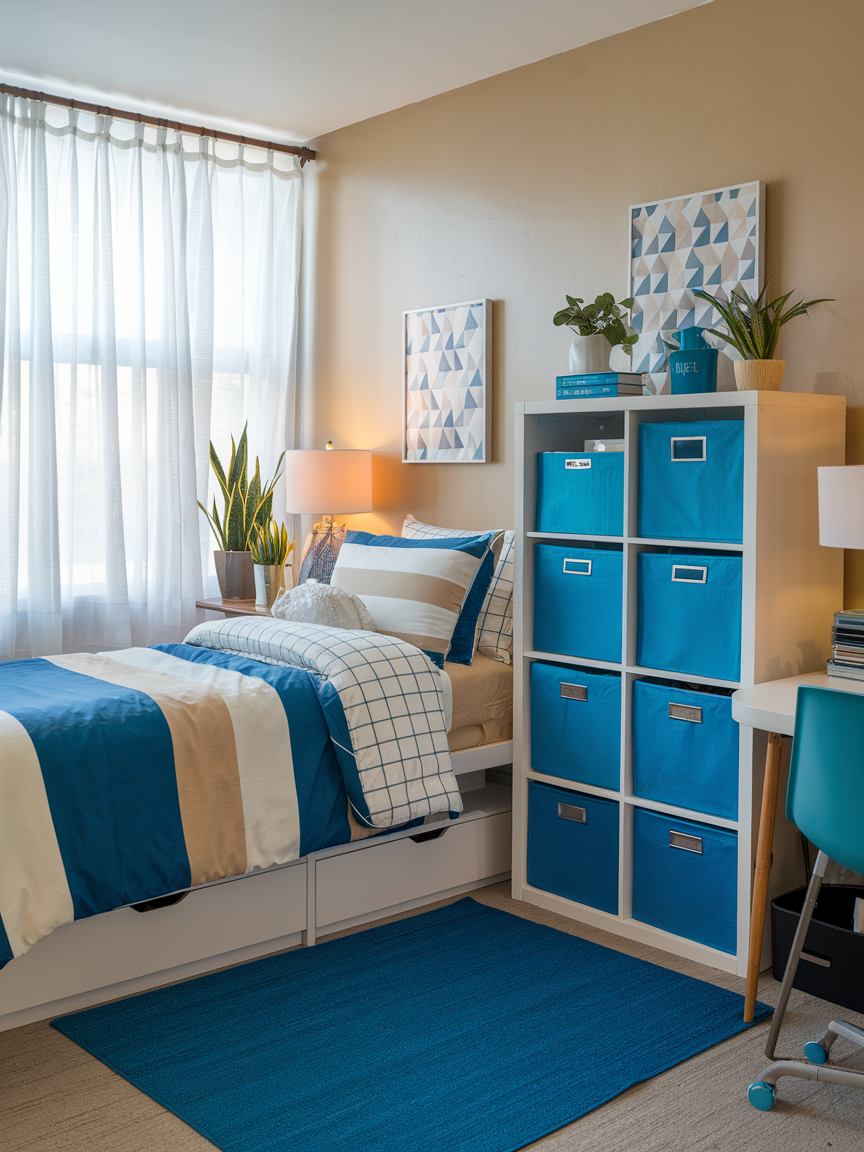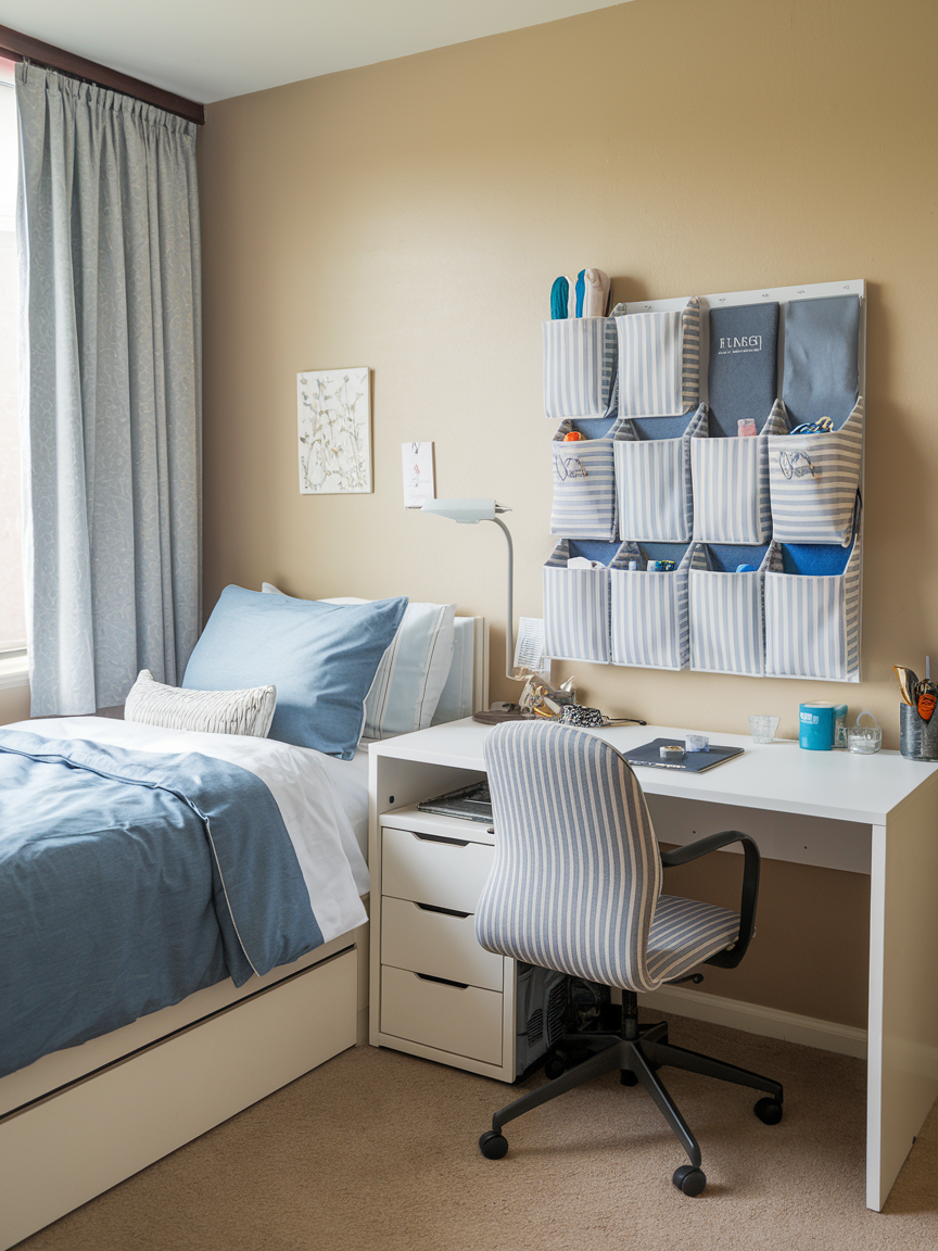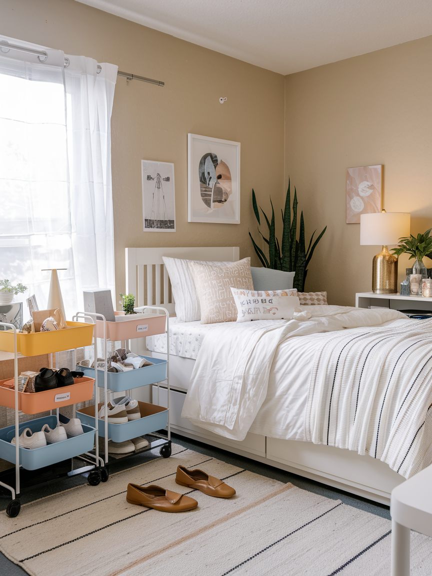 Under-bed storage is essential in compact dorms. Rolling bins, vacuum-sealed bags, or plastic containers make it easy to store off-season clothes, extra bedding, or rarely used items. Using labels keeps everything organized and easily retrievable. This hidden storage solution maximizes space and reduces clutter around the room. Combining under-bed storage with bed risers can further increase storage capacity. It’s a simple strategy that keeps your dorm tidy, helping you focus better and enjoy a cleaner, more organized space.