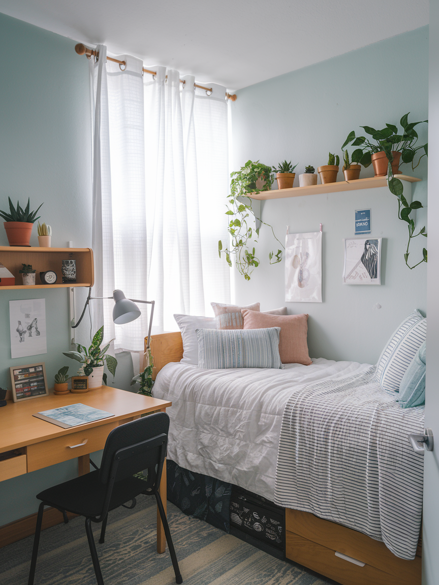 Small potted plants or succulents breathe life into a dorm room. They improve air quality, boost mood, and add color without taking up much space. Consider low-maintenance plants like snake plants, pothos, or cacti. Arrange them on shelves, desks, or windowsills for visual interest. Plants give your room a cozy, welcoming vibe while teaching a bit of responsibility along the way.