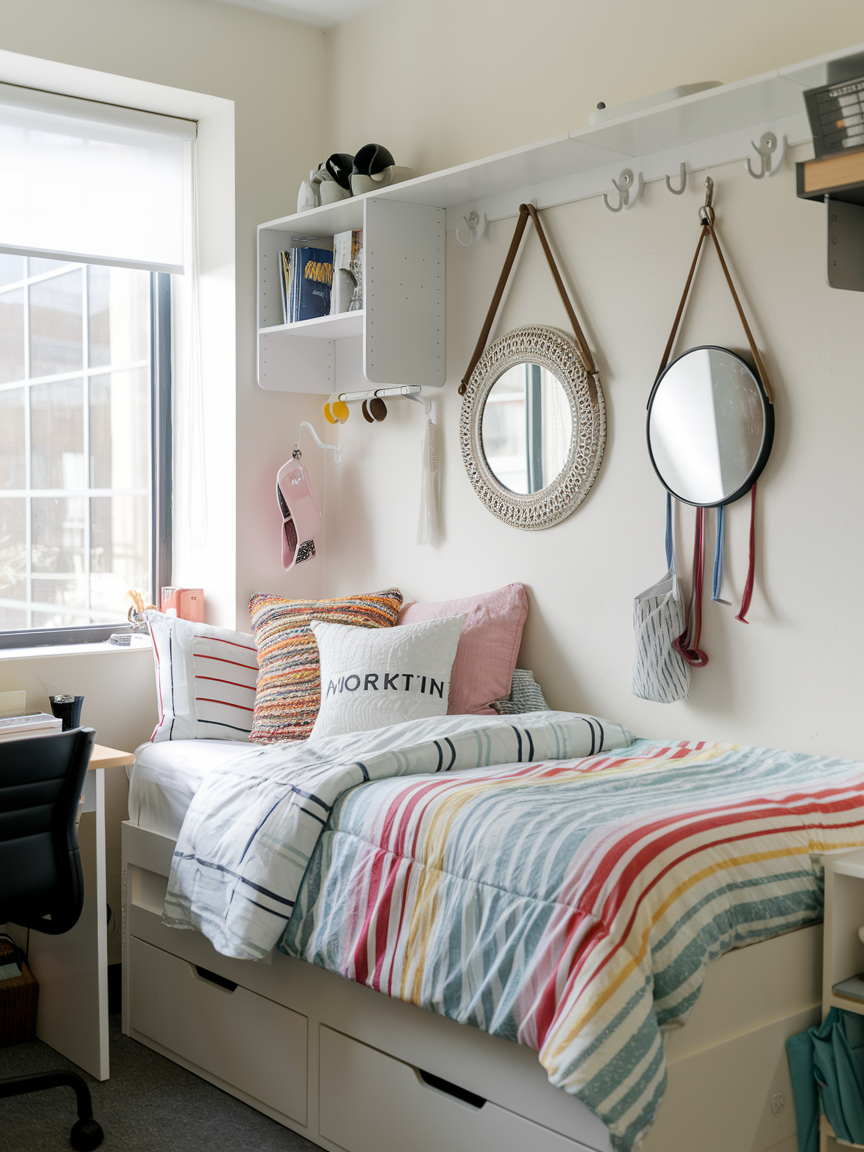 A hanging mirror not only helps with daily routines but also visually enlarges a small dorm room. Mirrors reflect light, brightening up darker corners, and add depth to compact spaces. Opt for a stylish frame to make it a decorative focal point. Some mirrors come with hooks or small shelves, combining functionality with aesthetics. Positioning a mirror near a window enhances natural light distribution, creating a more cheerful atmosphere. A well-placed mirror is a simple, affordable upgrade that significantly boosts both the practicality and charm of your dorm room.