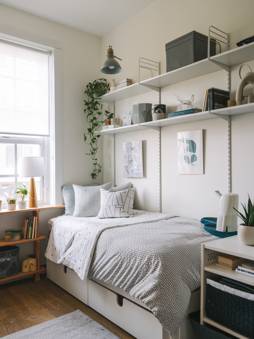 Small dorm rooms often lack sufficient storage space. Floating shelves are a stylish and practical solution. They provide a spot for books, plants, or small décor items while keeping surfaces clutter-free. Unlike bulky furniture, they take up minimal space and create a more open feel. Consider arranging them asymmetrically for visual appeal. They are also perfect for displaying personal items that add character, like souvenirs or framed photos. Functional yet decorative, floating shelves allow you to maximize vertical space without making the room feel cramped or overcrowded.