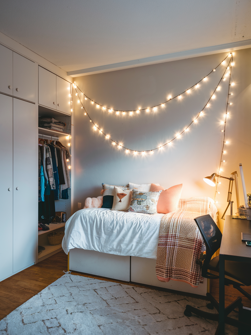 String lights instantly add warmth and coziness to a dorm. They provide soft, indirect lighting that’s perfect for relaxing or creating a chill atmosphere during late-night study sessions. Hang them along the walls, above the bed, or around your desk. Choose warm-white or colored lights to match your personal style. They are inexpensive, easy to install, and make your dorm feel inviting. The right lighting can completely transform the mood of your room without taking up precious floor space.
