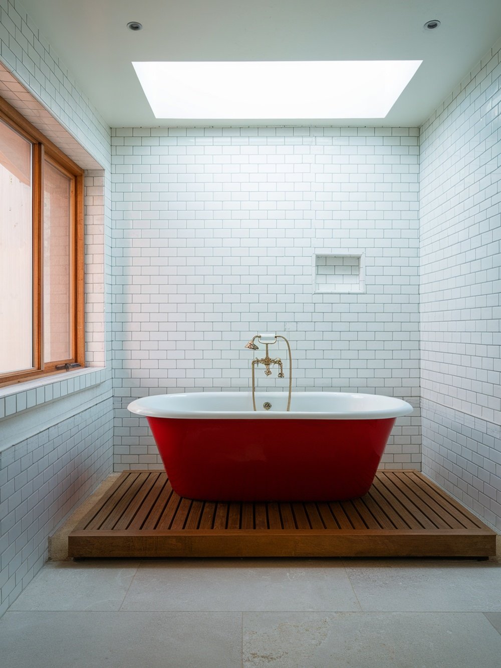 The bathtub is elegantly positioned on a wooden platform, which adds warmth to the overall design. This setup not only highlights the tub but also provides a modern touch. The natural light streaming in from the skylight enhances the space, making it feel airy and open. Choosing a red bathtub can transform your bathroom into a stylish retreat. It’s perfect for those who want to make a statement while enjoying a relaxing soak. Whether you prefer a classic or contemporary look, a red bathtub can fit seamlessly into your design vision.