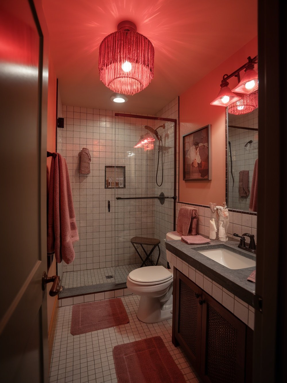 Red lighting fixtures can completely change the vibe of your bathroom. In this image, a stunning red fringe pendant light hangs from the ceiling, casting a warm glow throughout the space. The soft red light creates a cozy atmosphere, perfect for relaxation. The combination of the red light and the matching towels and rugs enhances the overall theme. It’s a great way to tie everything together while making a bold statement. The sleek design of the fixtures adds a modern touch, balancing the warmth of the red with a contemporary feel.