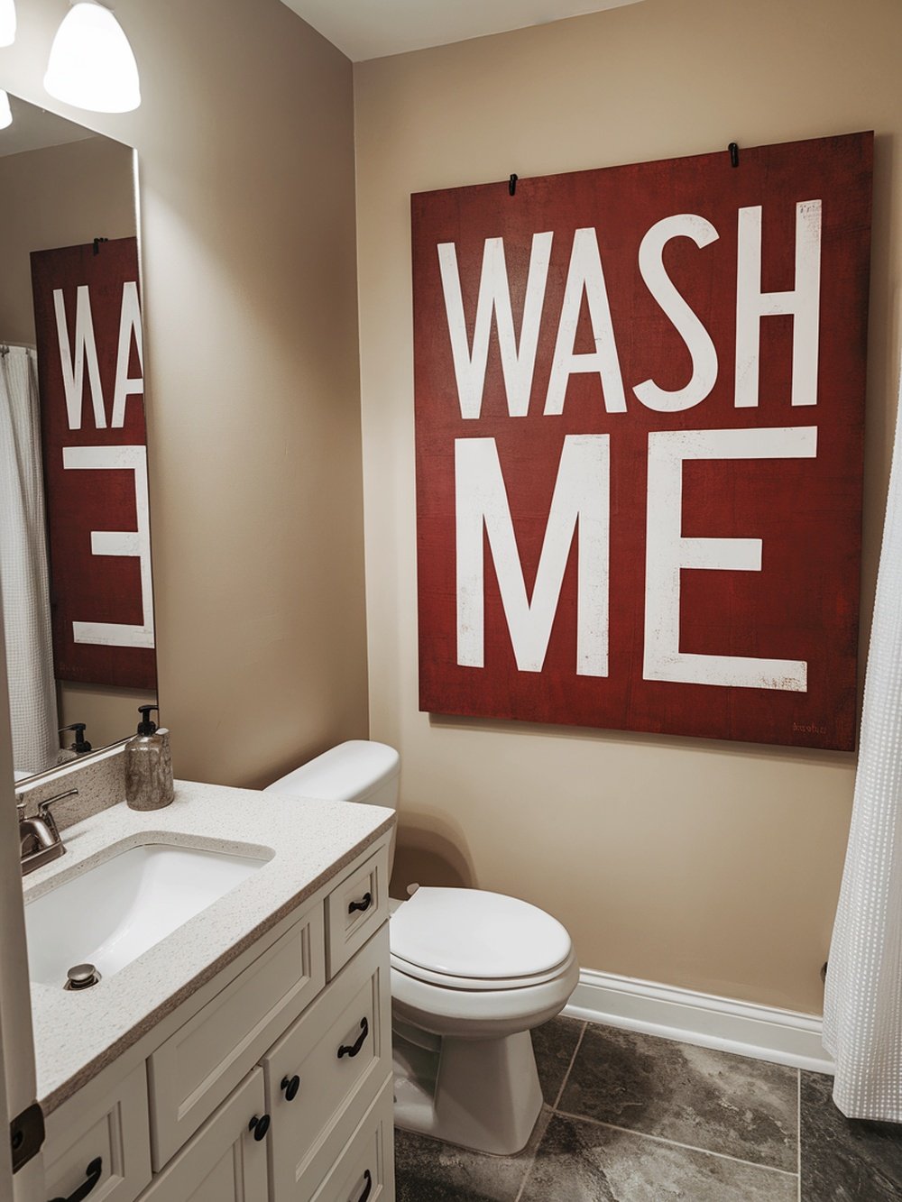 When it comes to adding personality to your bathroom, statement artwork can make a big impact. The image showcases a bold red sign that reads ‘WASH ME,’ instantly drawing attention. This piece not only serves as a fun reminder but also enhances the overall decor. The vibrant red color contrasts beautifully with the neutral tones of the bathroom, creating a striking visual effect. It’s a simple yet effective way to incorporate a pop of color into a space that often feels utilitarian.