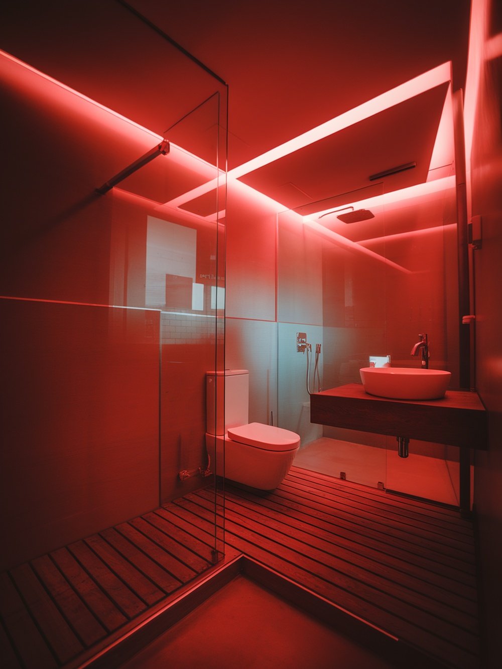 Red lighting can completely change the vibe of a bathroom. It creates a striking and bold atmosphere that’s hard to ignore. The image showcases a modern bathroom with sleek lines and a minimalist design, enhanced by vibrant red lighting. The red glow from the ceiling and walls adds warmth and drama, making the space feel cozy yet edgy. This type of lighting can be perfect for creating a relaxing environment, especially during a long soak in the tub.