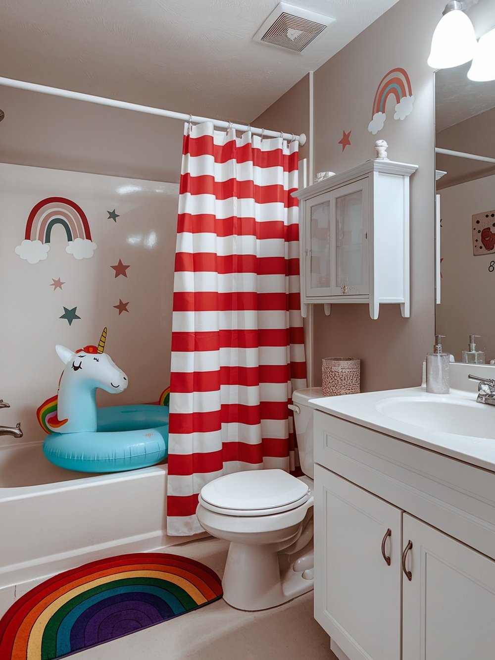 This bathroom features a fun and lively red and white striped shower curtain that instantly grabs attention. The bold stripes create a playful vibe, making the space feel inviting and cheerful. Complementing the shower curtain, the bathroom has a cute inflatable unicorn in the tub, adding a whimsical touch. The rainbow bath mat on the floor ties in beautifully with the overall theme, enhancing the colorful atmosphere.