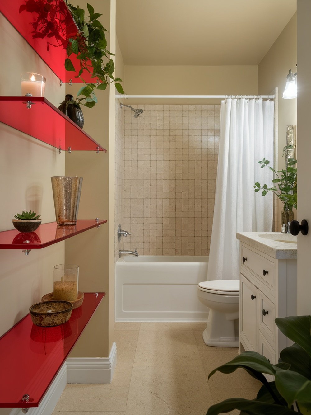 Incorporating red glass shelving can also be a great way to introduce color without overwhelming the room. It’s a fun way to showcase your favorite decor while keeping everything organized. Plus, the glossy finish reflects light beautifully, enhancing the overall brightness of the bathroom.