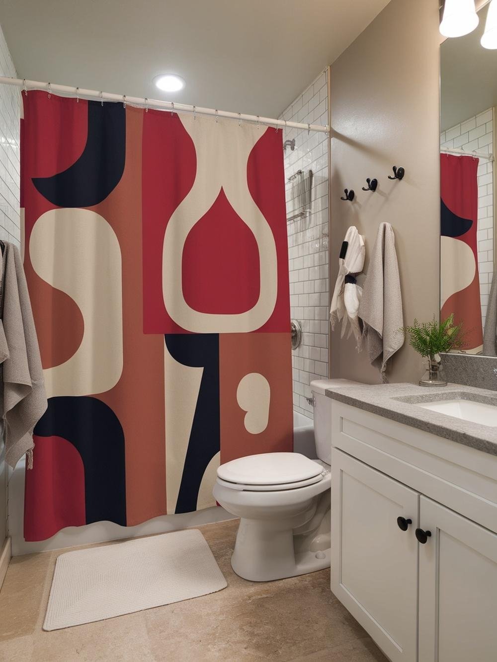 A chic red shower curtain can be a game-changer in any bathroom. The vibrant colors and bold patterns instantly draw the eye, making the space feel lively and inviting. This particular curtain features a mix of red, cream, and navy shapes that create a modern and artistic vibe.