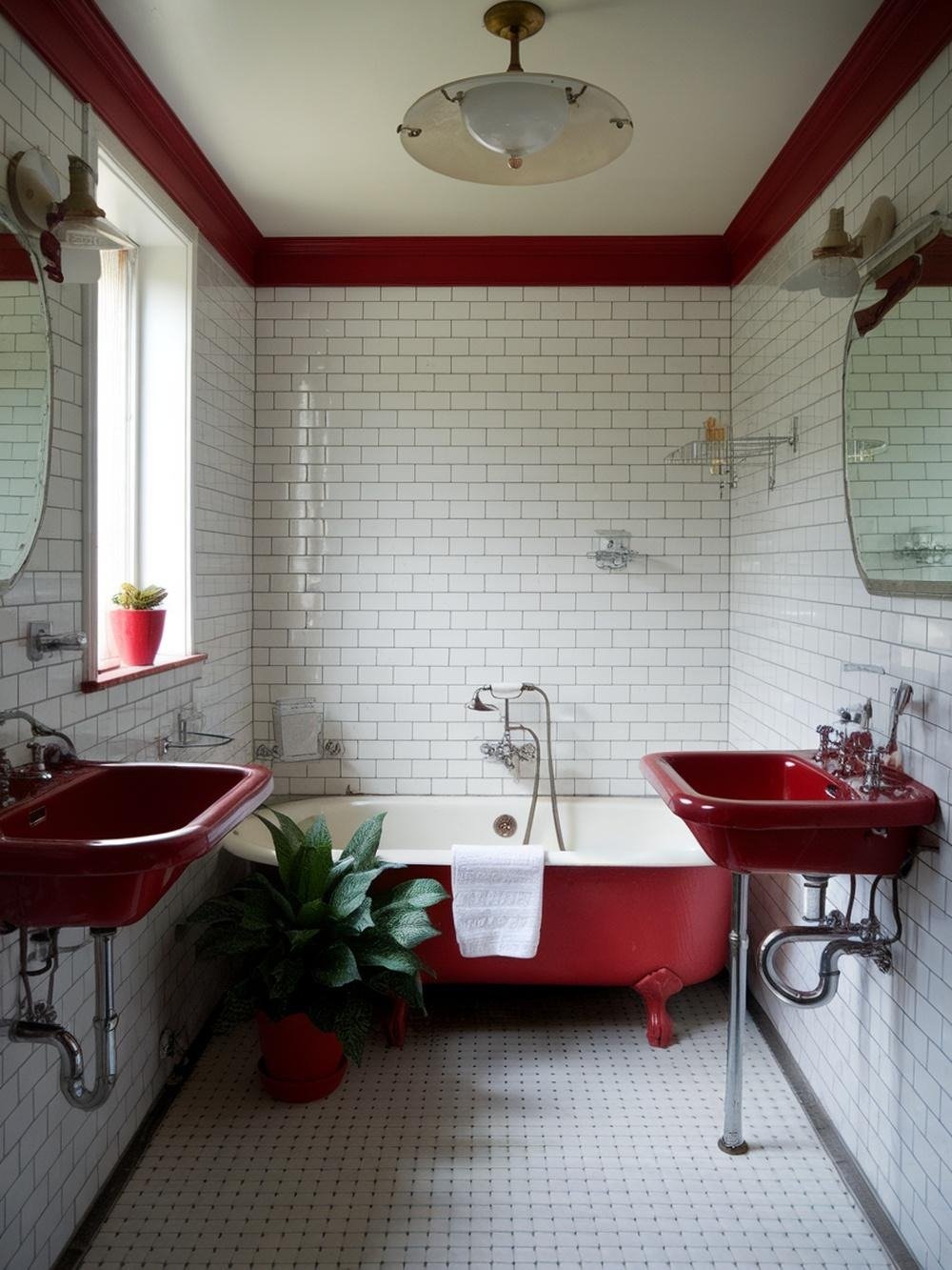 Vintage red bathroom fixtures bring a unique charm to any space. The image showcases a delightful blend of classic design and bold color. The red accents, from the sink’s faucet to the toilet seat, create a striking focal point. The white tiles provide a clean backdrop, allowing the red elements to pop. This contrast enhances the vintage feel, making the bathroom feel both nostalgic and fresh. The round mirror with a red frame adds a playful touch, while the wall-mounted light fixtures offer practical illumination.