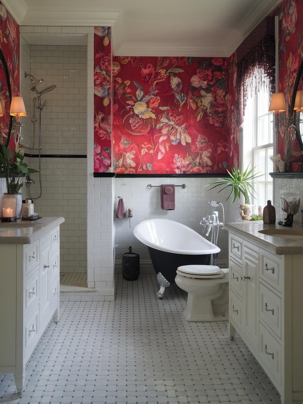 Incorporating red floral decor can be a fun way to express personality in your bathroom. Whether you opt for wallpaper, tiles, or accessories, the key is to balance the boldness of red with softer elements to create a welcoming environment.